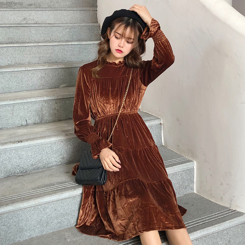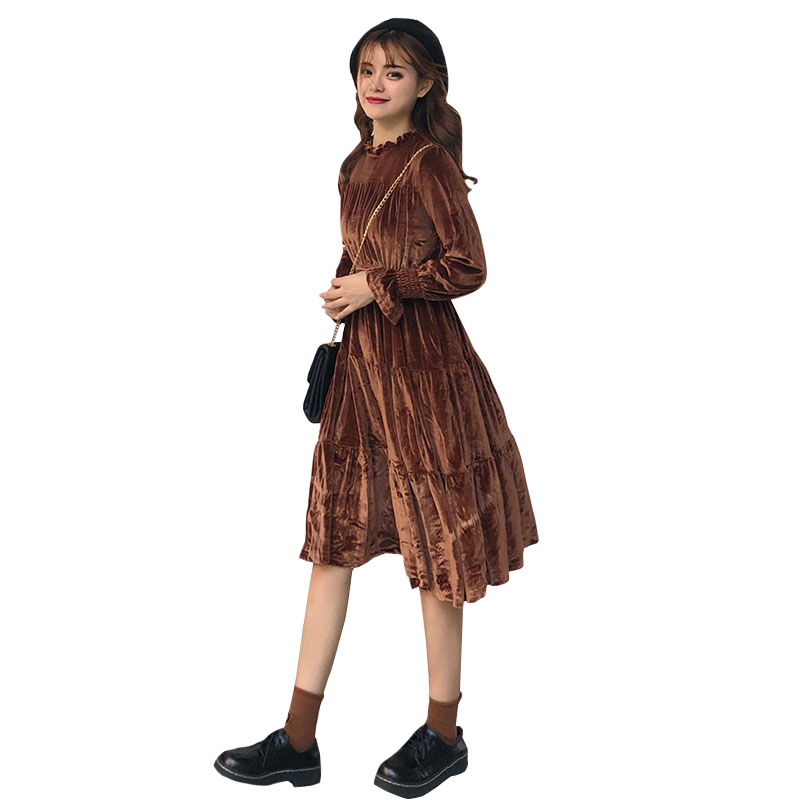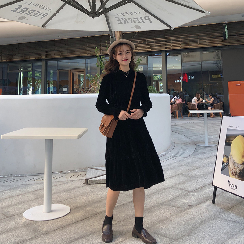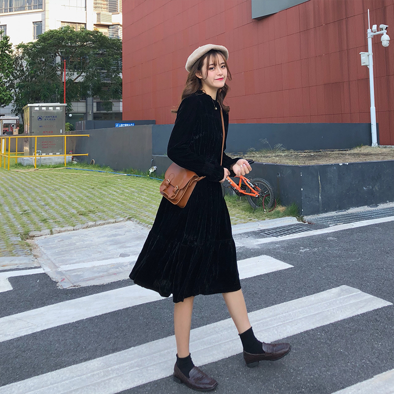 2018新款秋冬女裝韓版寬松絲絨中長款長袖連衣裙氣質長裙學生裙子