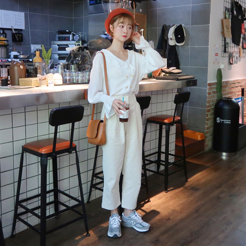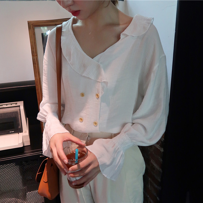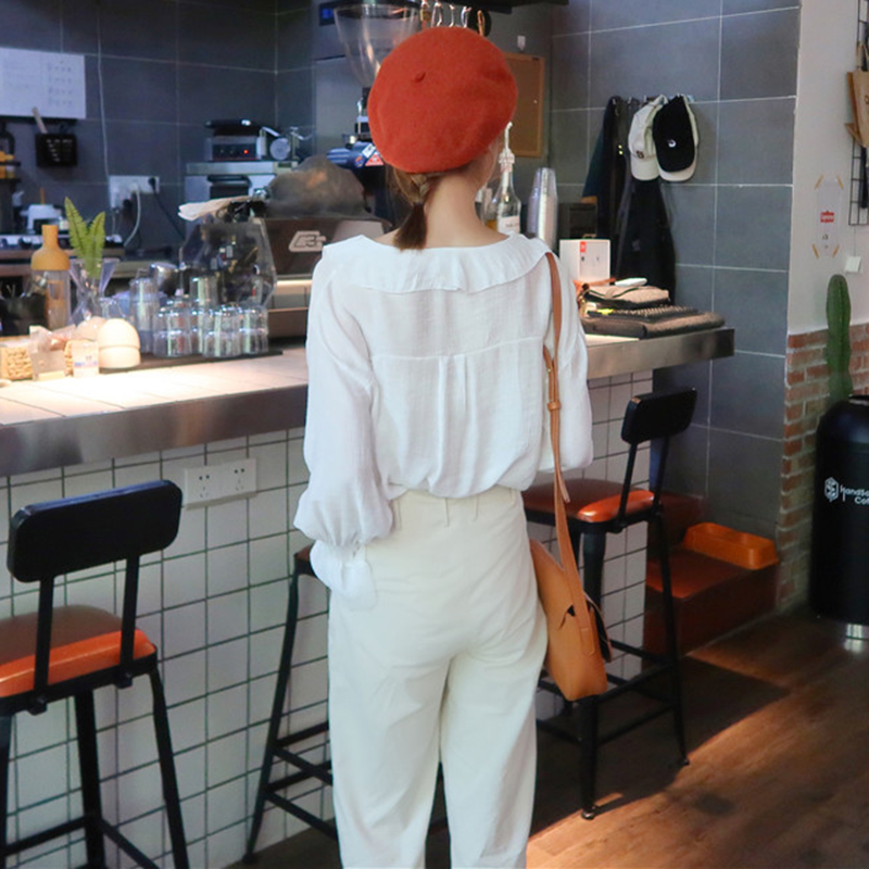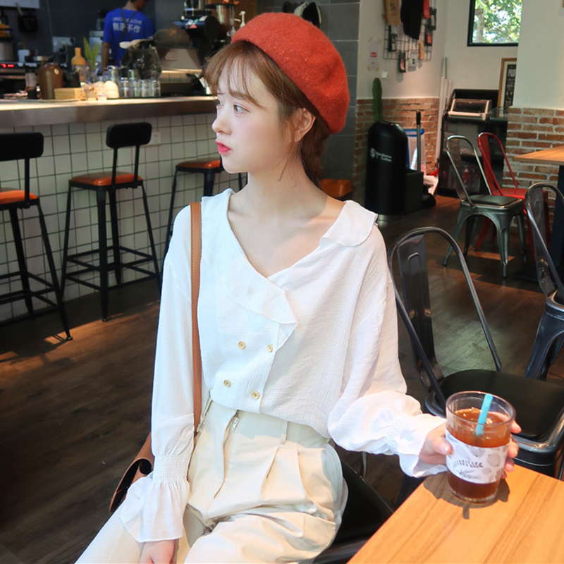/ 簡約喇叭長袖白襯衫秋裝2018新款韓版少女小清新襯衣休閑打底上衣