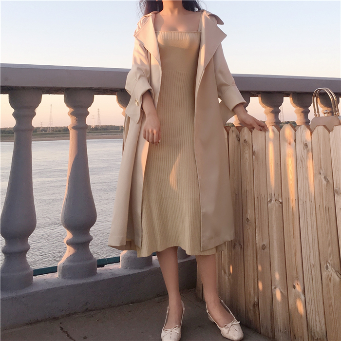 秋裝女2018新款套裝時尚兩件套中長款港風復古外套風衣+百褶裙潮