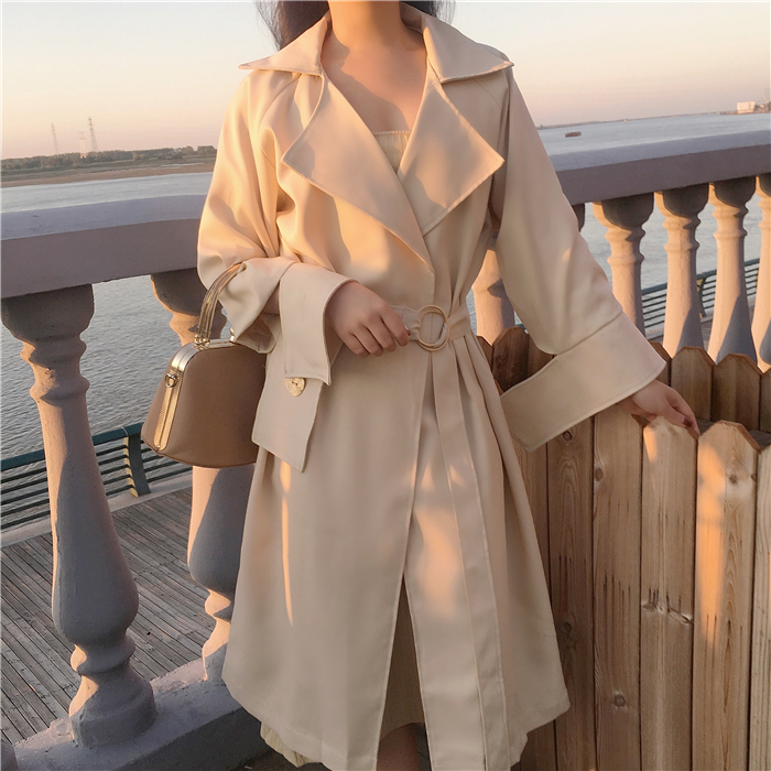 風衣女中長款韓版秋季2018新款純色系腰寬松復古外套(有里布)潮