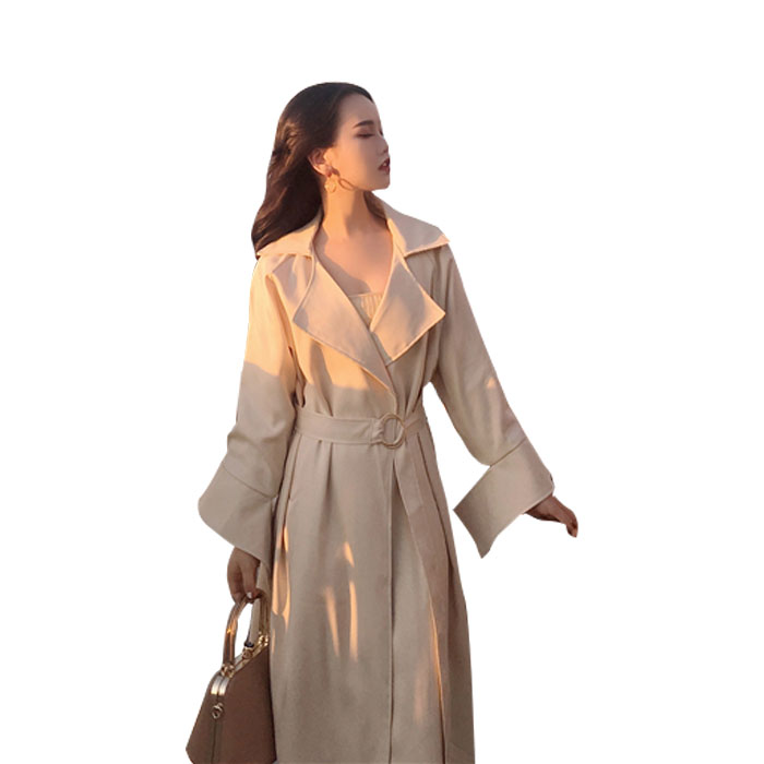 / 韓版秋裝女新款復古chic時尚翻領大袖子系帶收腰中長款風衣外套潮