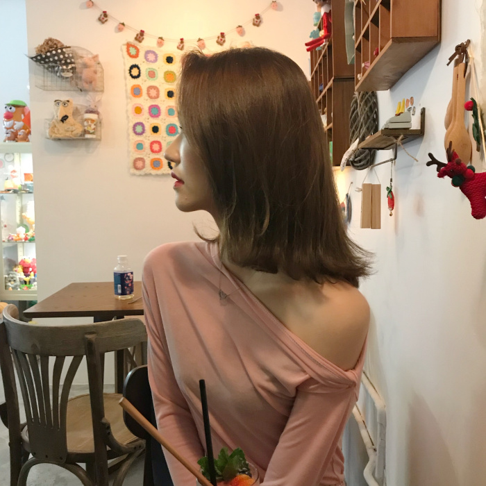 / 早秋純色修身氣質斜領露鎖骨小心機性感百搭港味復古一字肩上衣女