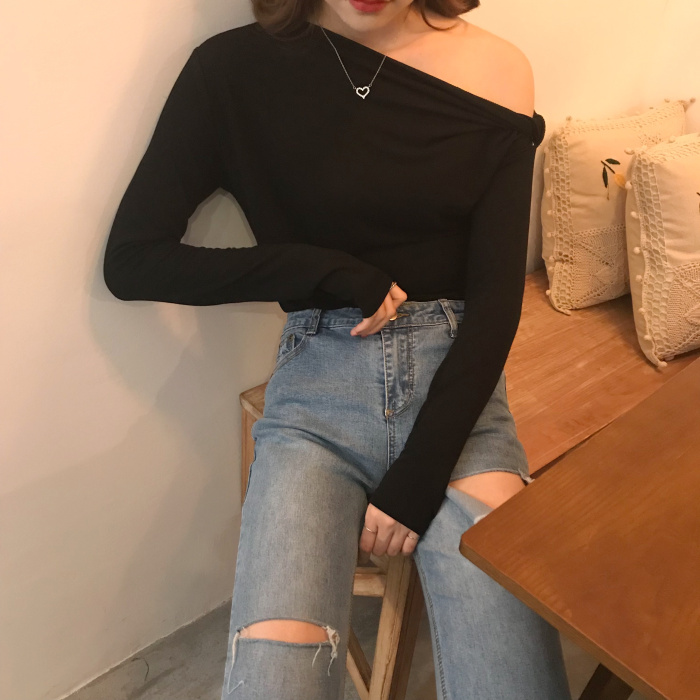 早秋純色修身氣質斜領露鎖骨小心機性感百搭港味復古一字肩上衣女