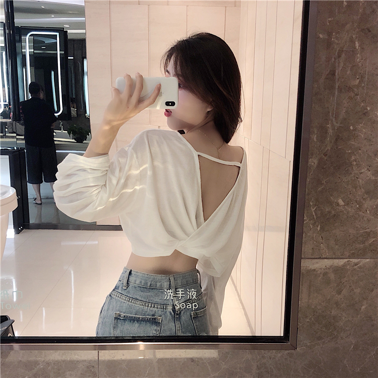 2018新款短款小心機性感打底衫大V領露背T恤長袖防曬衫女港味上衣