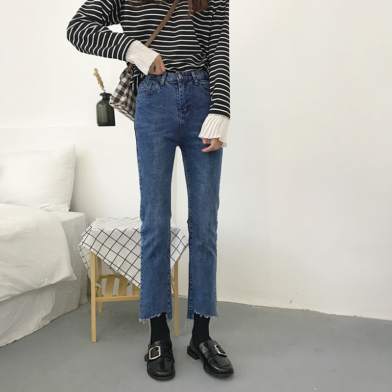 秋裝女裝韓版寬松彈力高腰顯瘦不規則褲腳直筒褲九分褲牛仔褲長褲