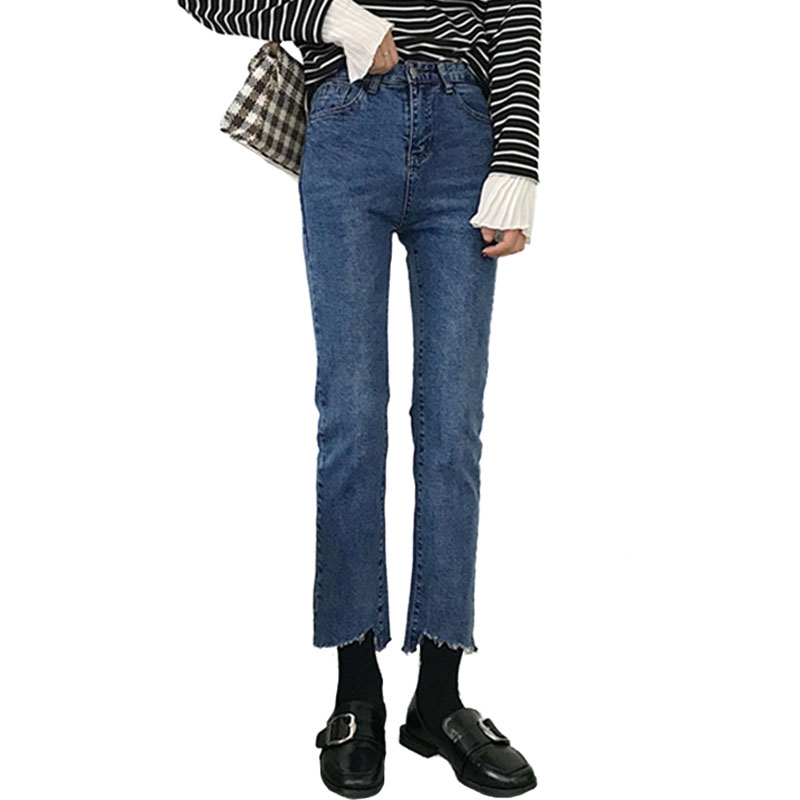 / 秋裝女裝韓版寬松彈力高腰顯瘦不規則褲腳直筒褲九分褲牛仔褲長褲