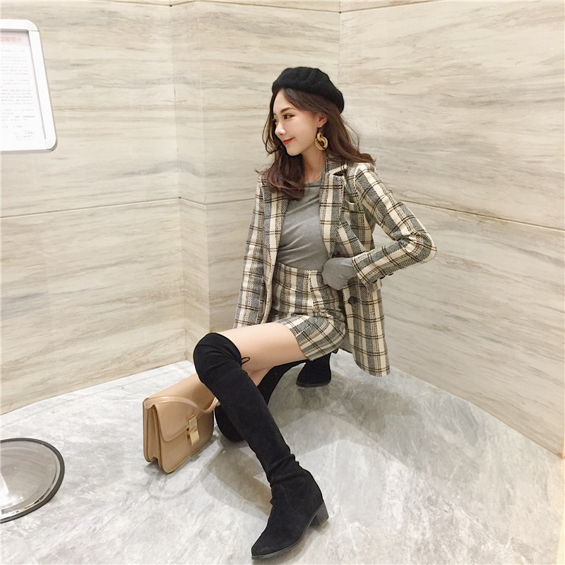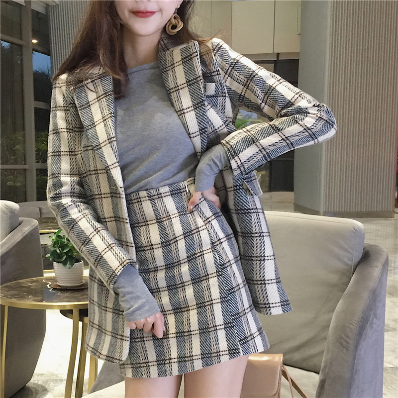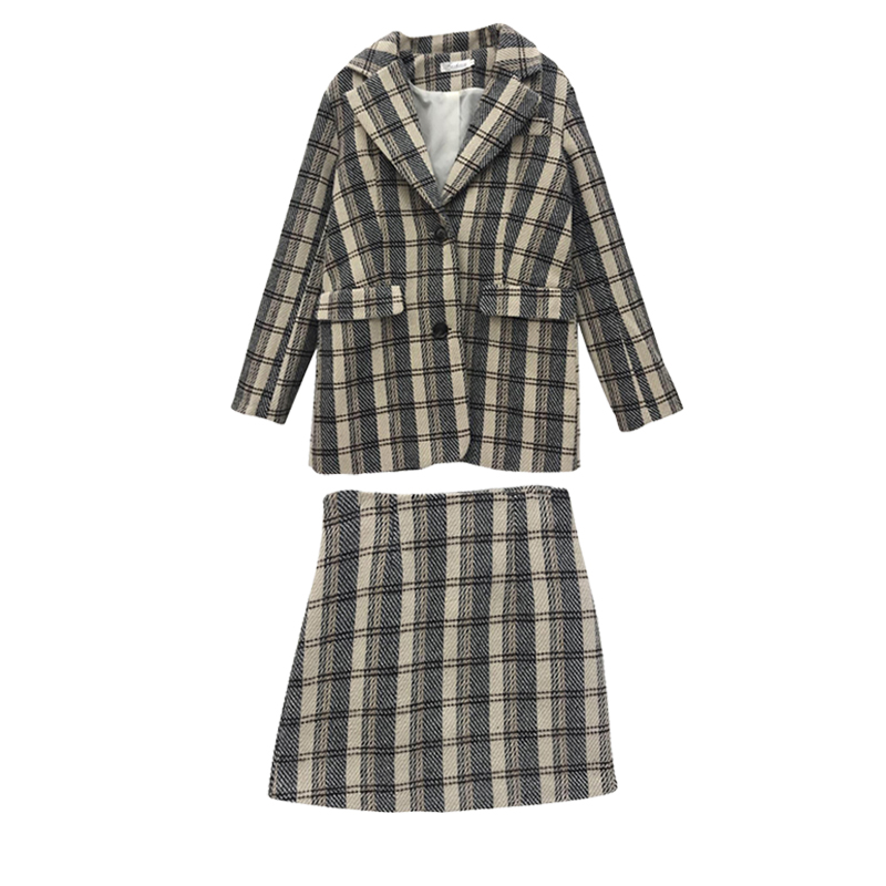 / 新款兩件套女英倫復古格子毛呢小西裝外套高腰修身包臀半身裙套裝