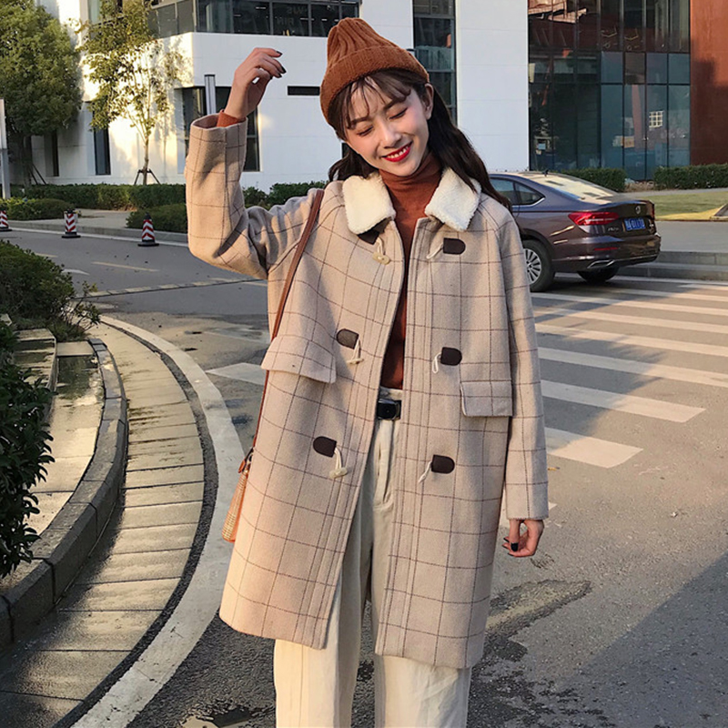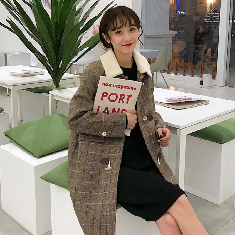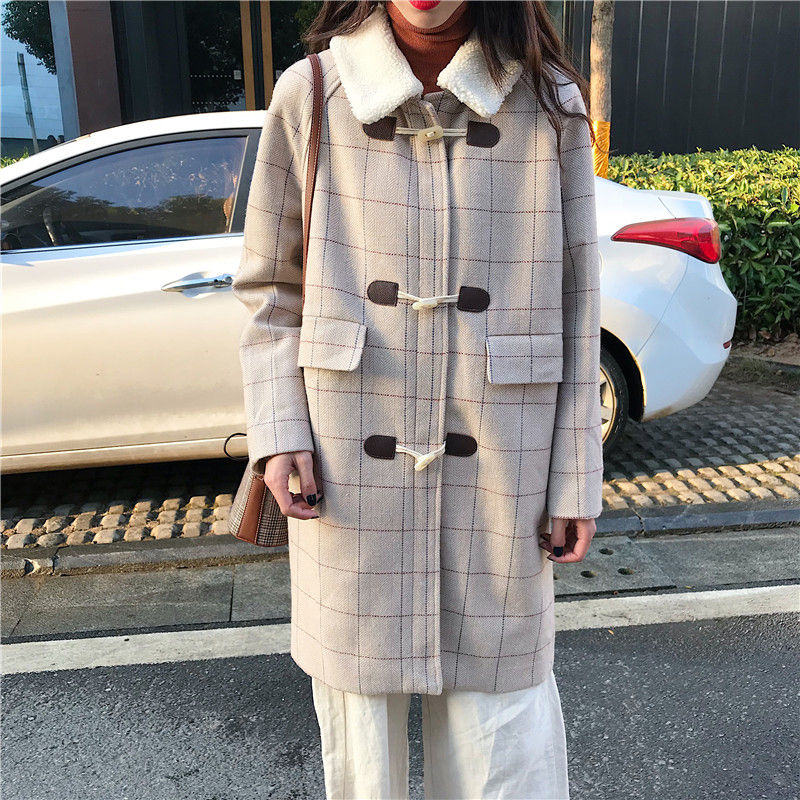 秋冬女裝新款2018牛角扣流行呢子大衣時尚寬松中長款格子毛呢外套