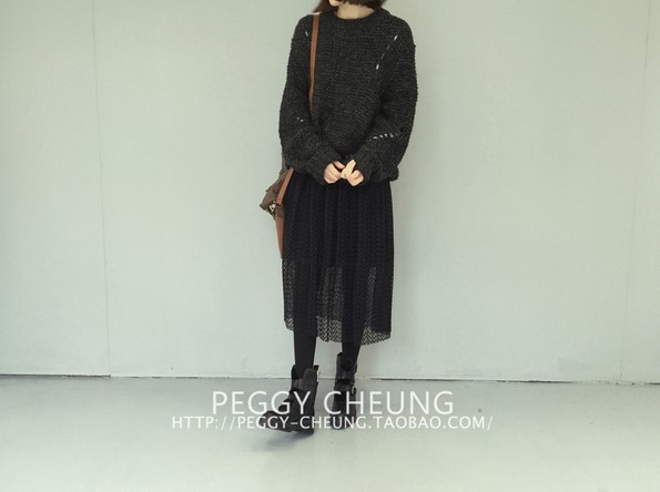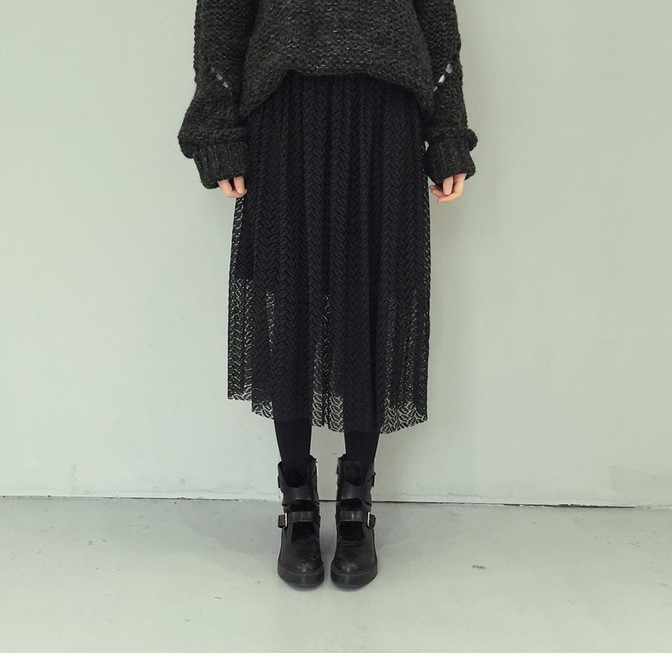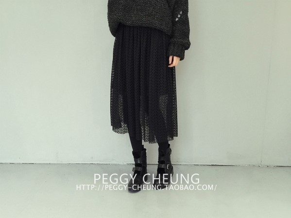 / 2017春裝新款歐美女裝加絨內襯鏤空蕾絲半身裙黑色中長款百褶裙潮