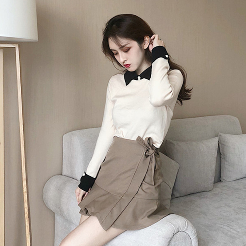 / 秋冬女裝2018新款氣質修身拼色翻領外穿打底薄毛衣百搭套頭針織衫
