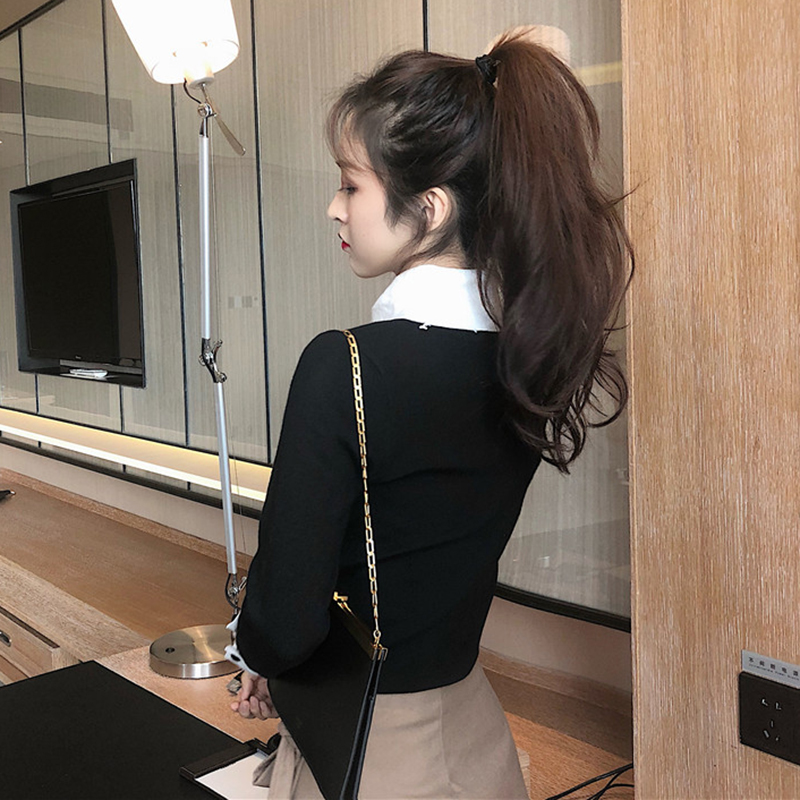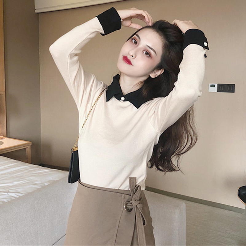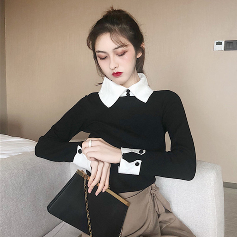 秋冬女裝2018新款氣質修身拼色翻領外穿打底薄毛衣百搭套頭針織衫