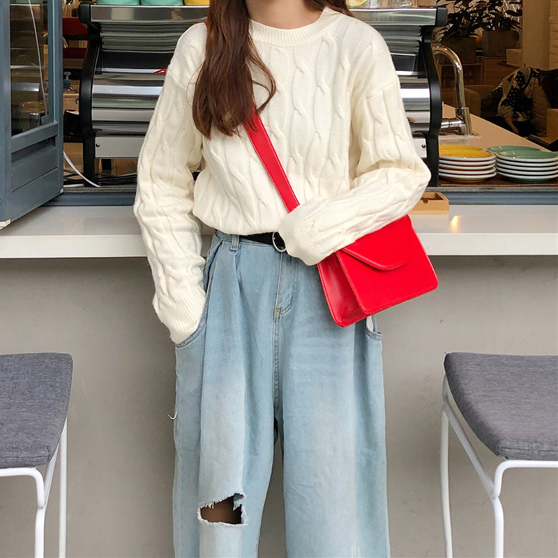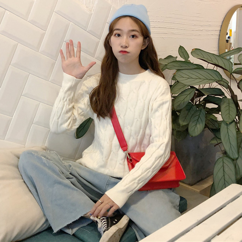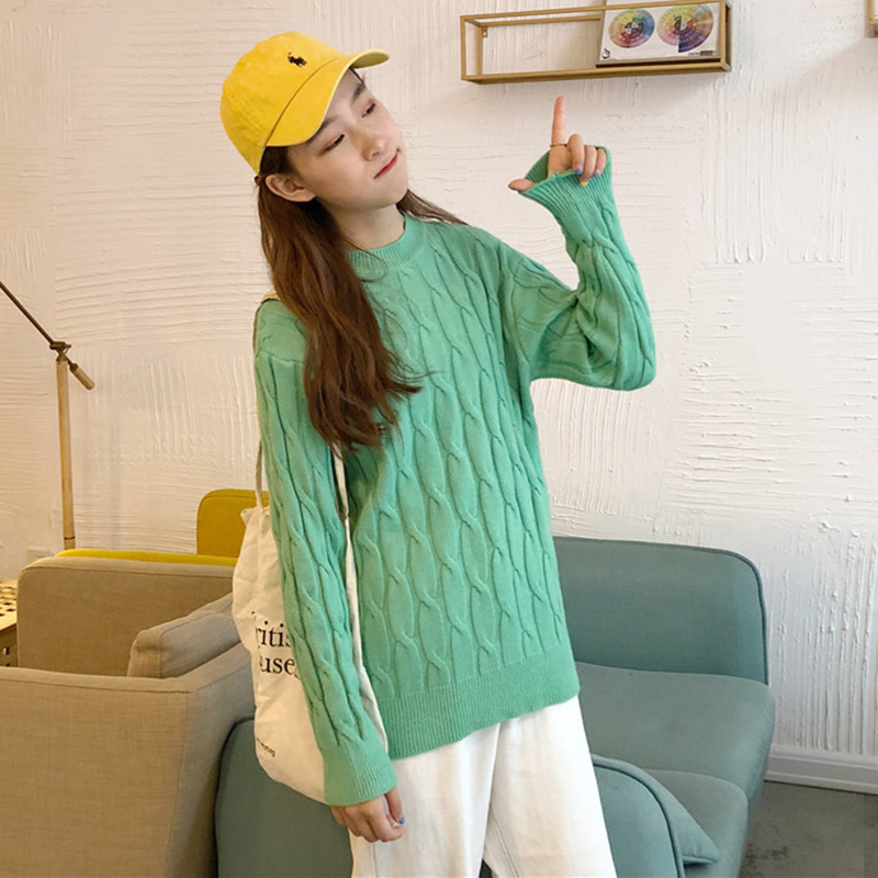 / 復古麻花圓領套頭毛衣女秋裝新款學生寬松長袖針織衫純色休閑上衣