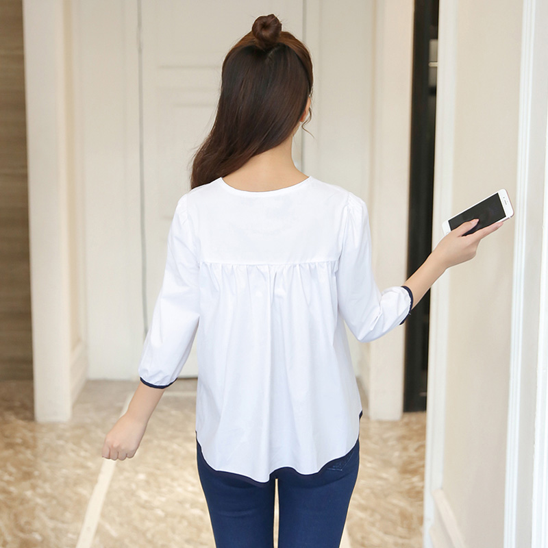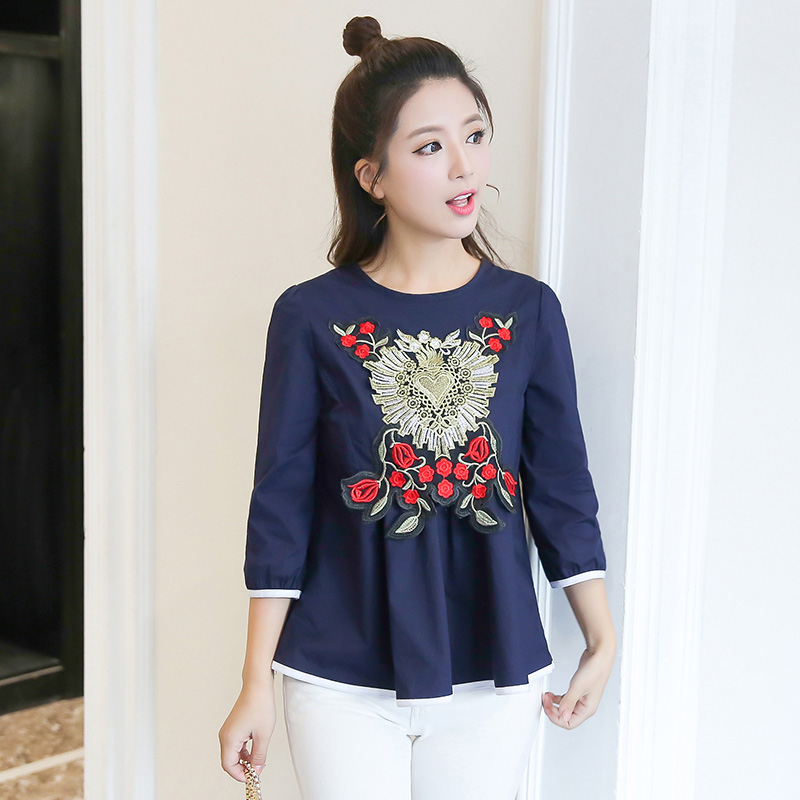 / 春季新款民族風刺繡花朵七分袖襯衫女a字寬松高腰顯瘦娃娃衫上衣