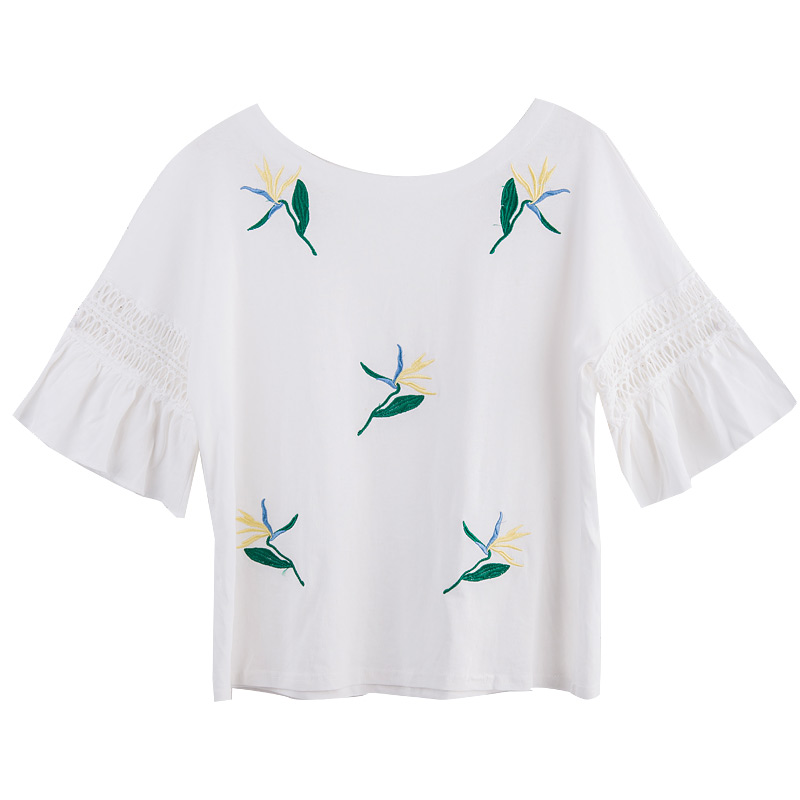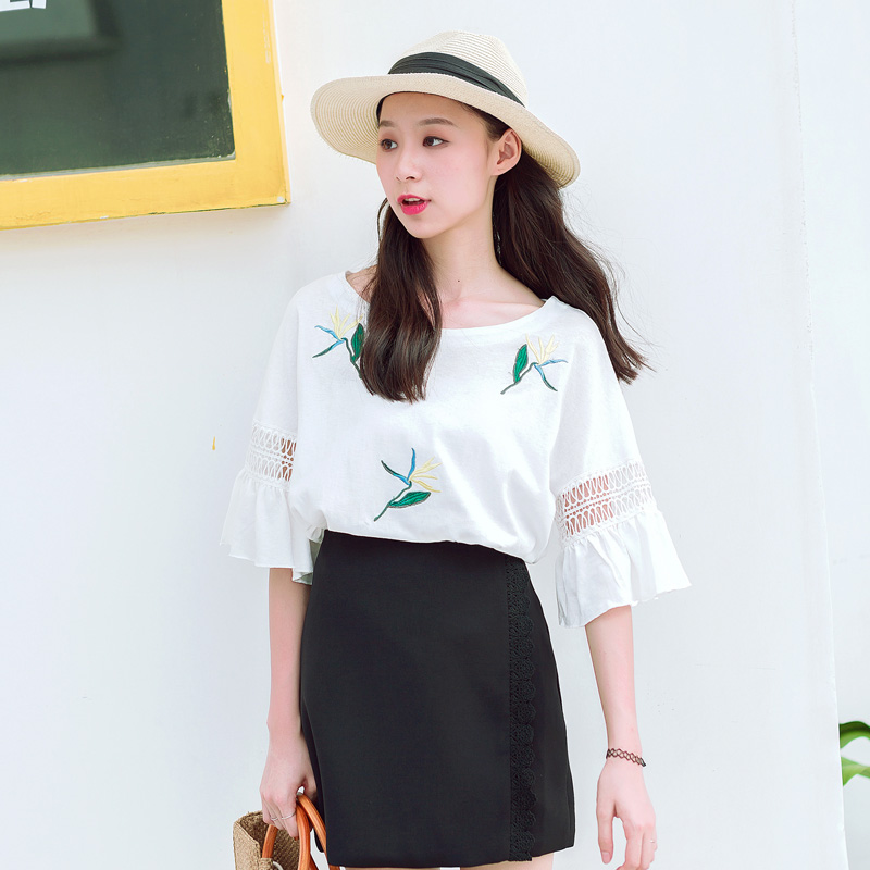 / 短袖襯衫女夏裝新款韓版時尚百搭學生刺繡喇叭袖寬松襯衫上衣
