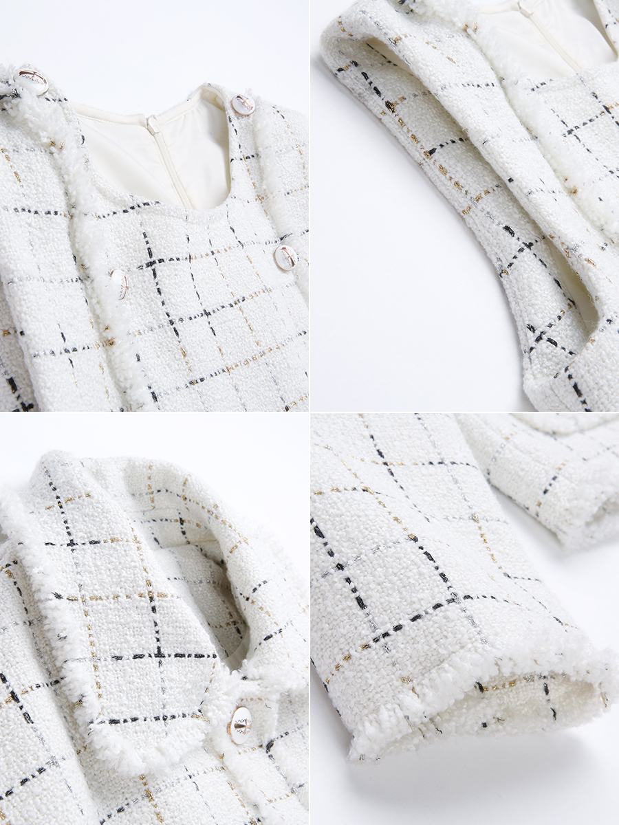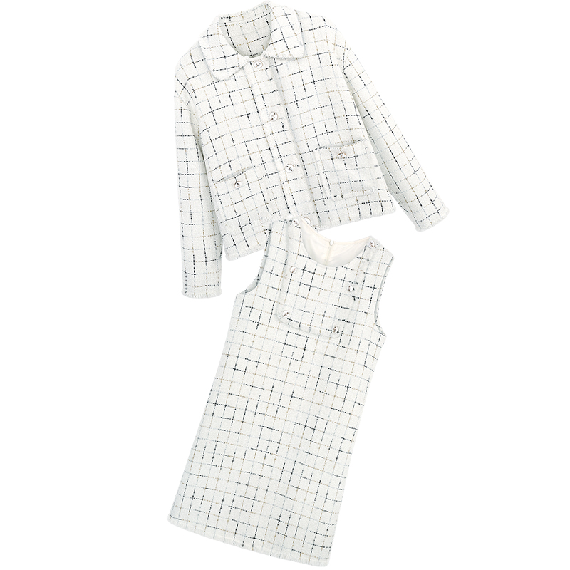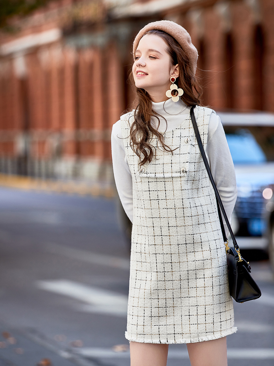 MG小象白色格子連衣裙女2018新款長袖寬松外套中長款冬季背心裙子