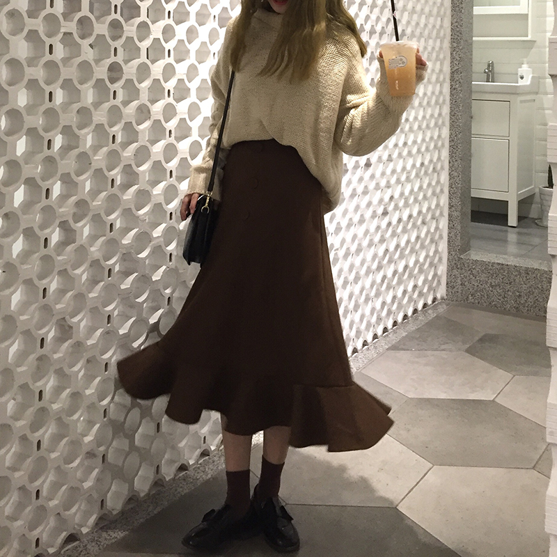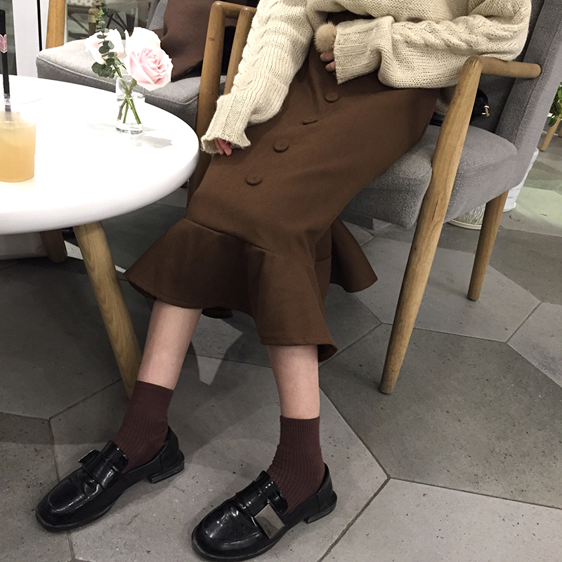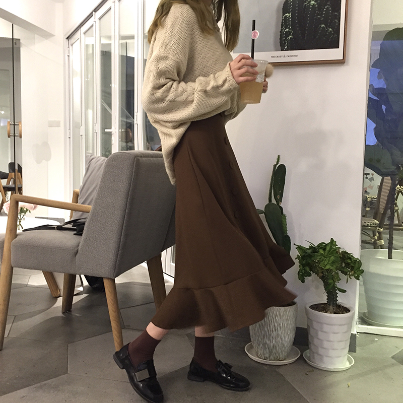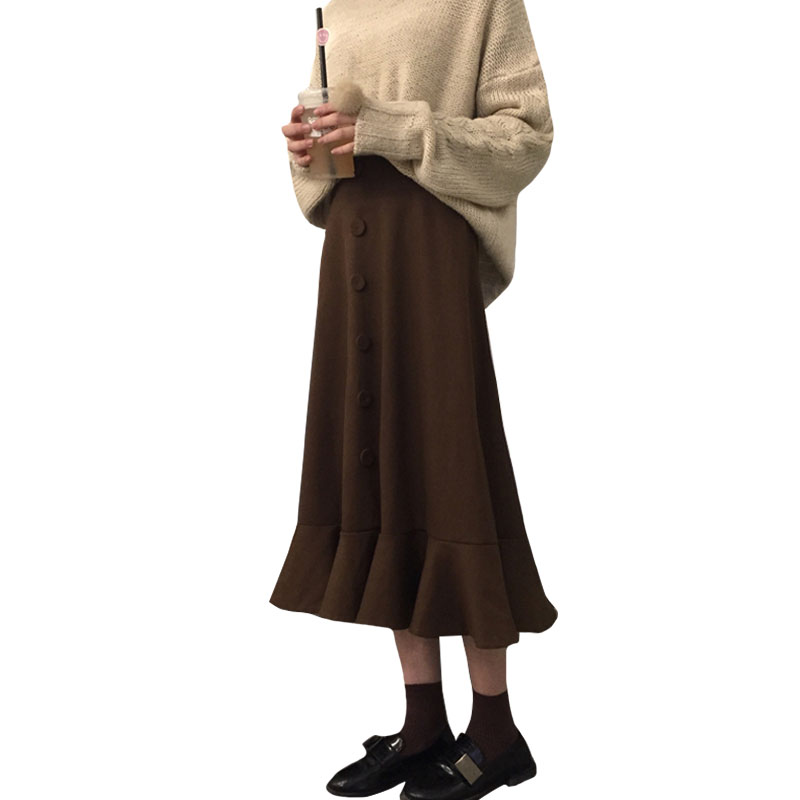 / 2018新款秋冬韓版簡約中長款裝飾扣A字裙荷葉邊半身裙學生裙子女