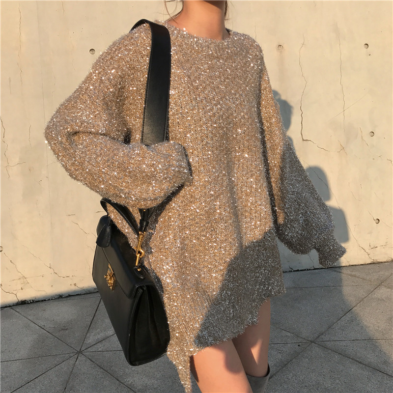 / 復古氣質中長款上衣女慵懶風時尚百搭chic秋季不規則寬松閃閃毛衣