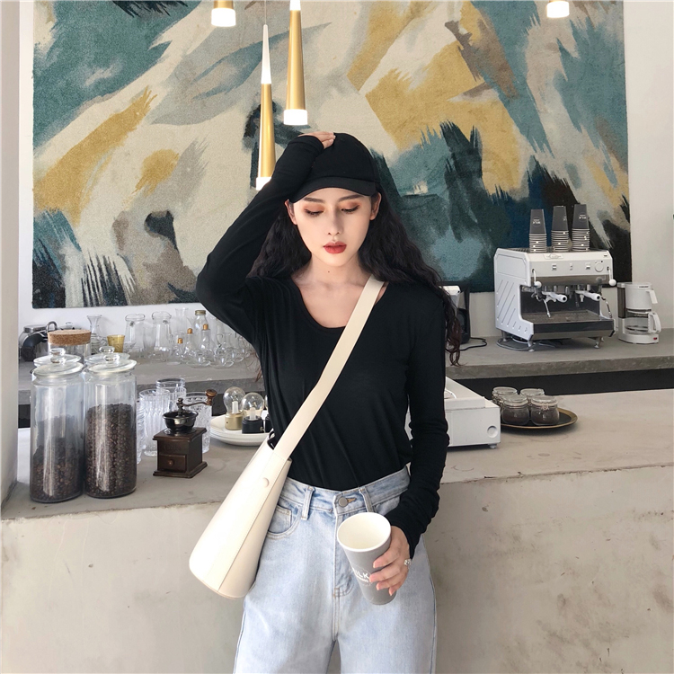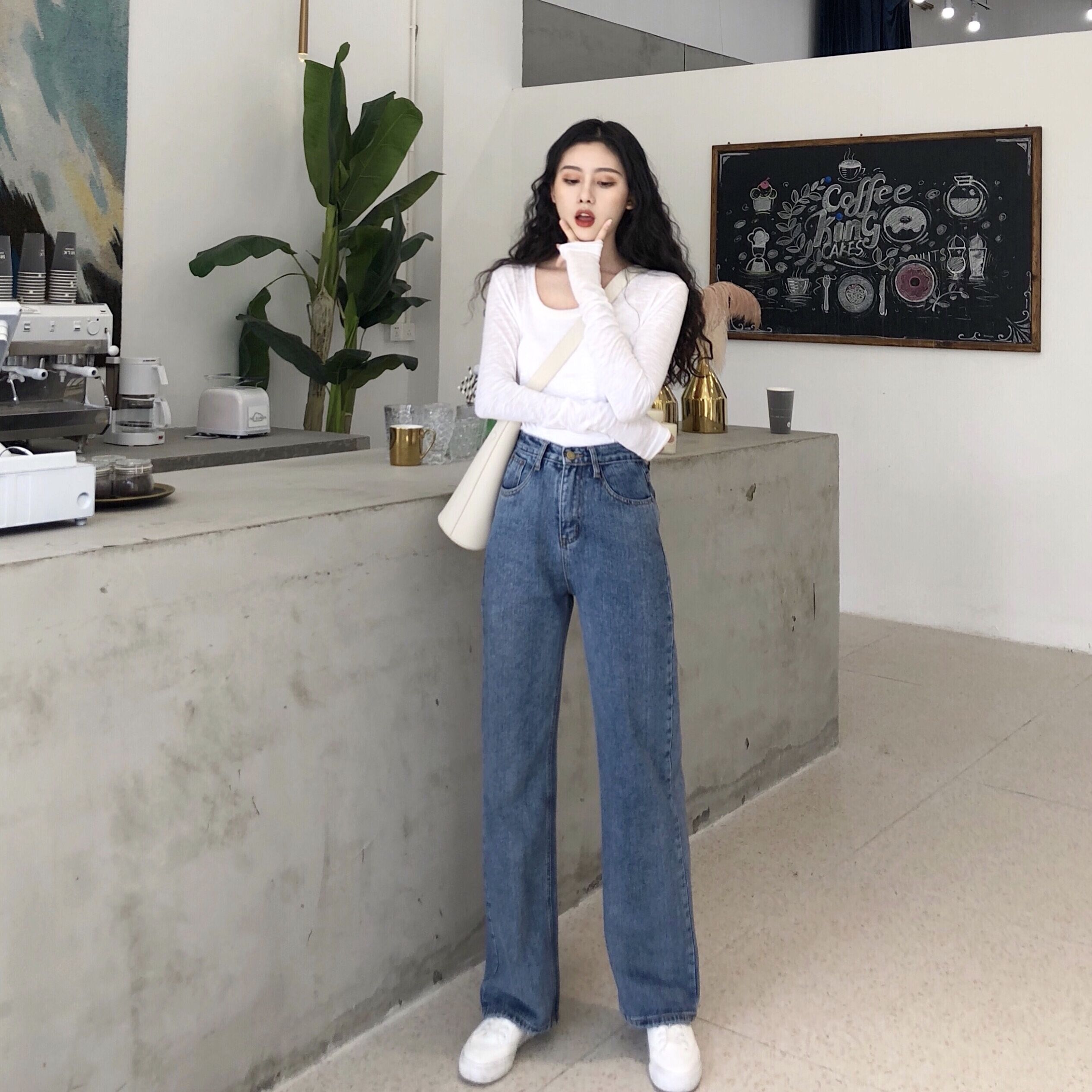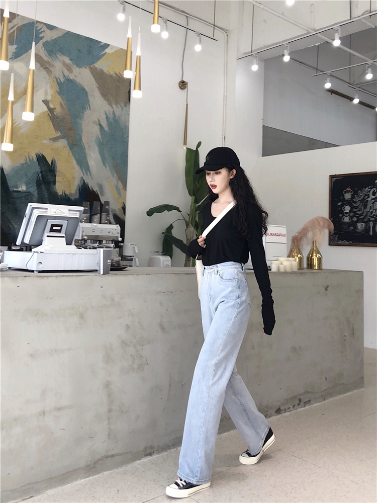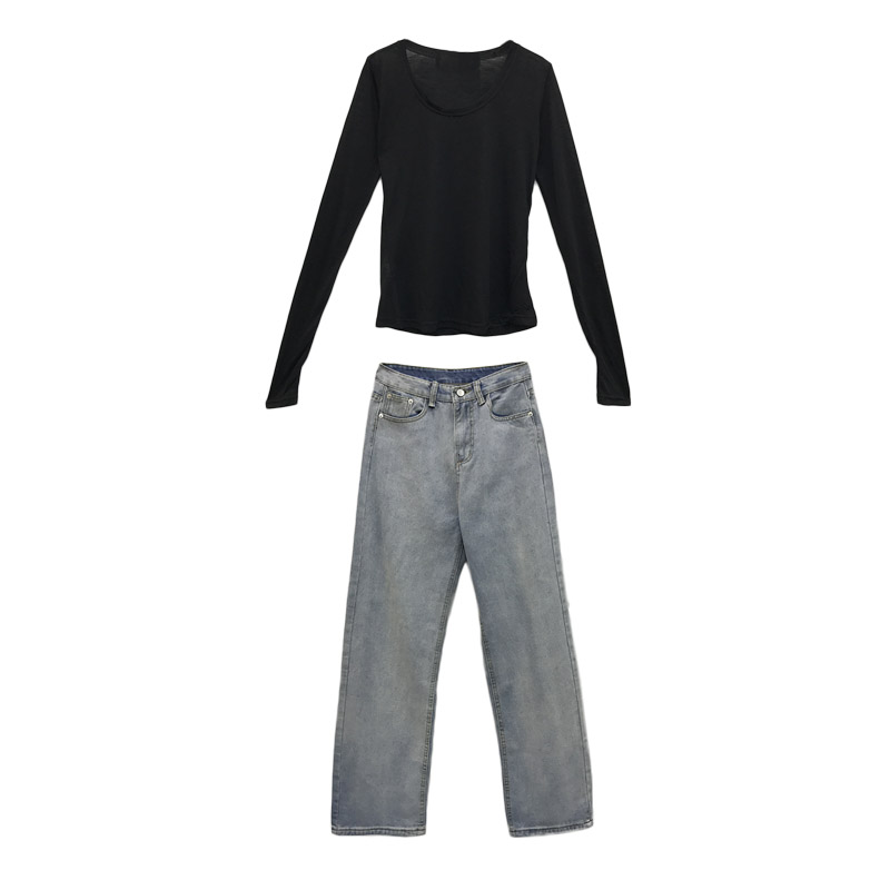 chic早秋上衣薄款純色長袖打底T恤+韓版高腰牛仔褲直筒褲兩件套裝