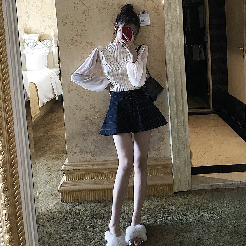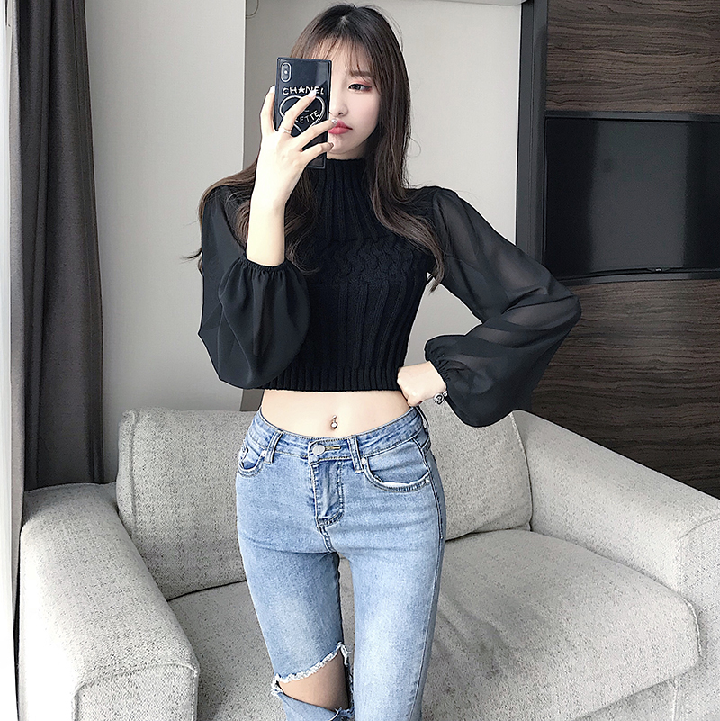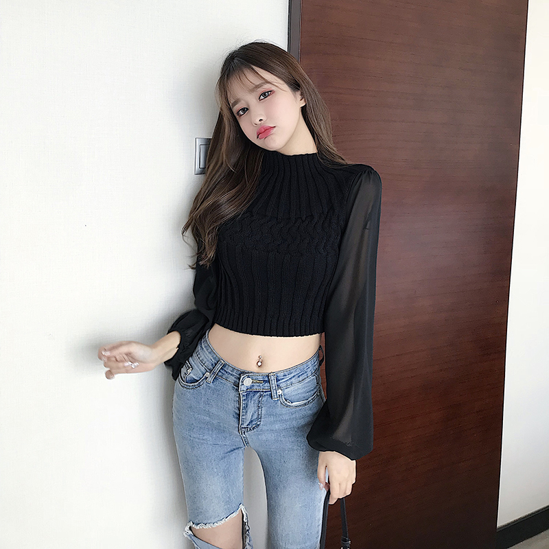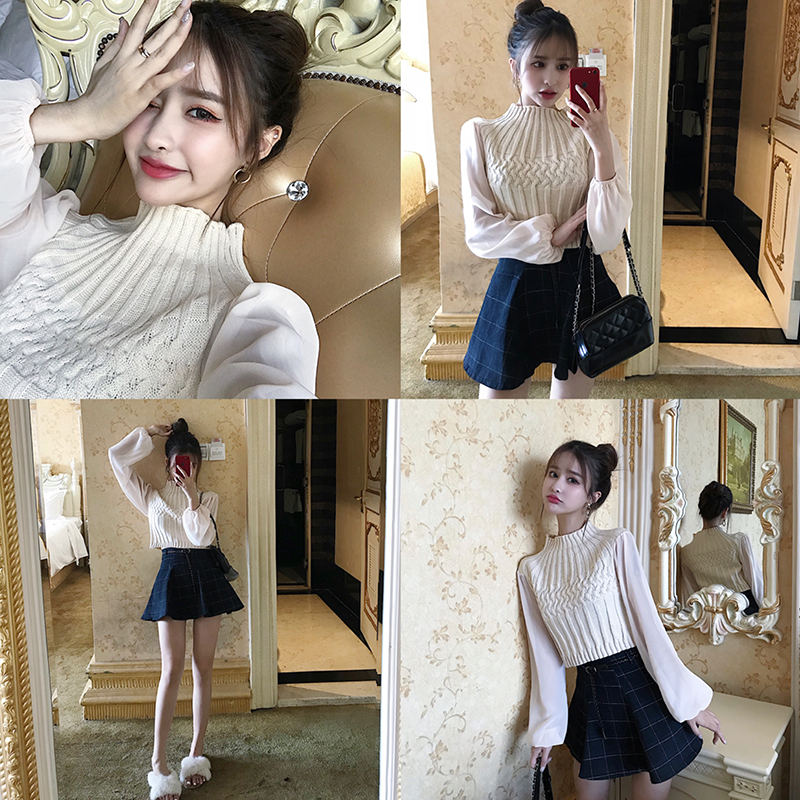 / 短款雪紡燈籠長袖拼接針織衫上衣女潮秋季時尚氣質百搭新款打底衫