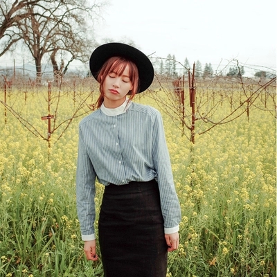 文藝小清新長袖學院風襯衣寬松豎條紋立領襯衫女韓范學生百搭簡約