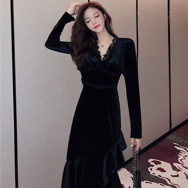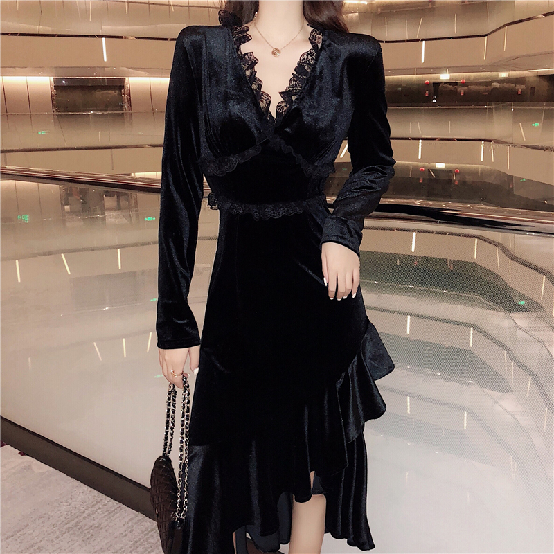 / 氣質蕾絲花邊V領egg黑色連衣裙子女秋冬裝新款復古絲絨法式桔梗裙