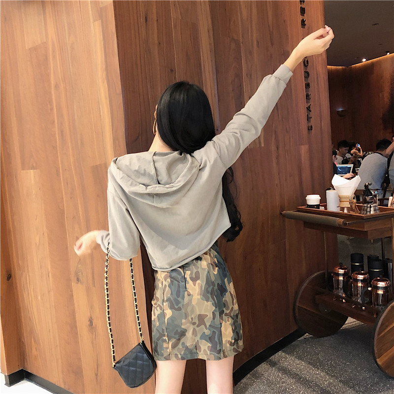 / 韓風chic長袖抽繩連帽短款衛衣+高腰迷彩半身裙套裝女夏2018新款