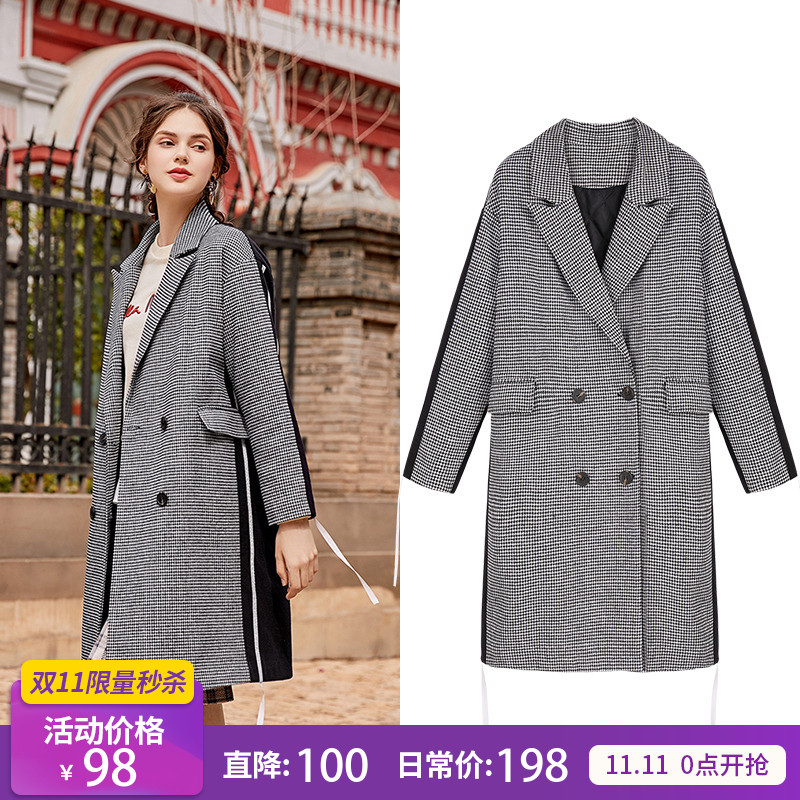 【直降100元】【98元雙11清倉】MG小象拼接雙排扣格子毛呢大衣