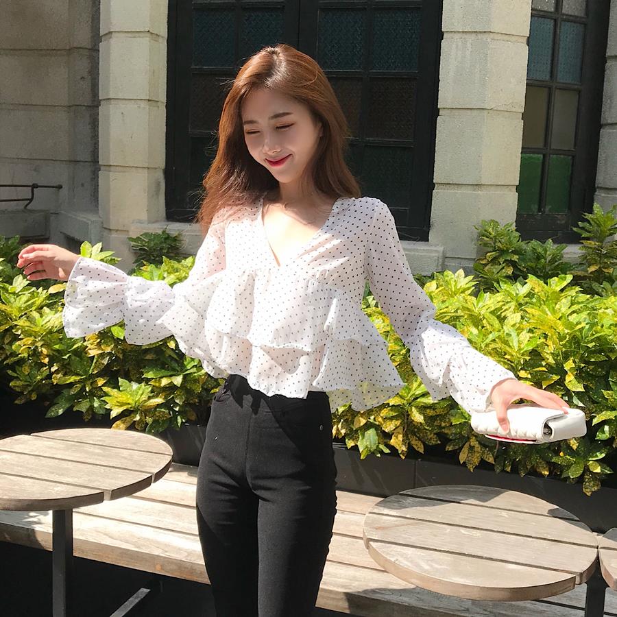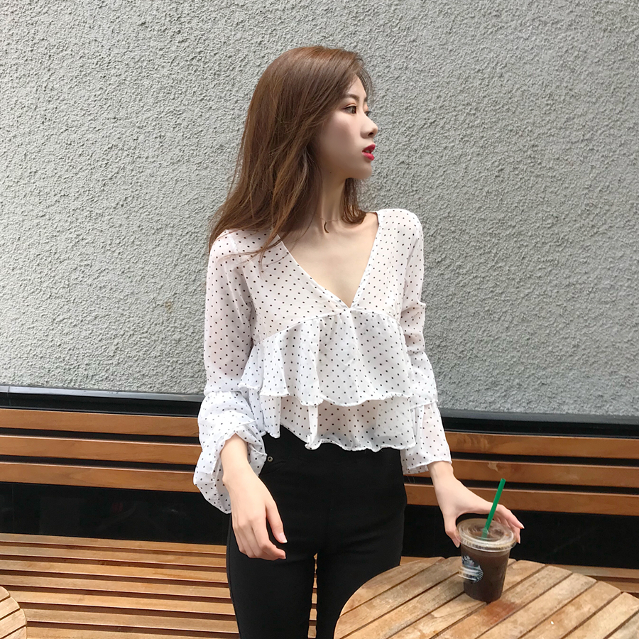 / 甜美短款時尚溫柔風chic波點荷葉邊喇叭袖雪紡衫V領寬松百搭上衣