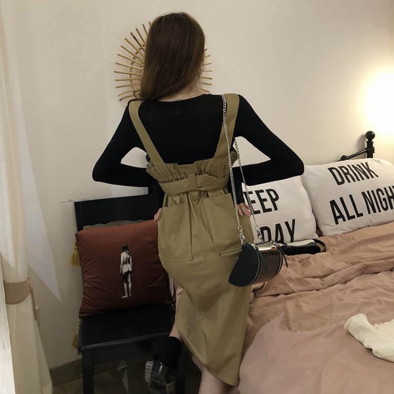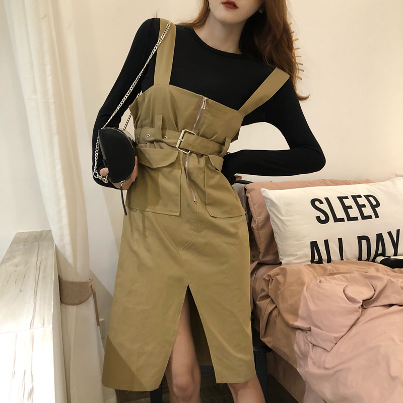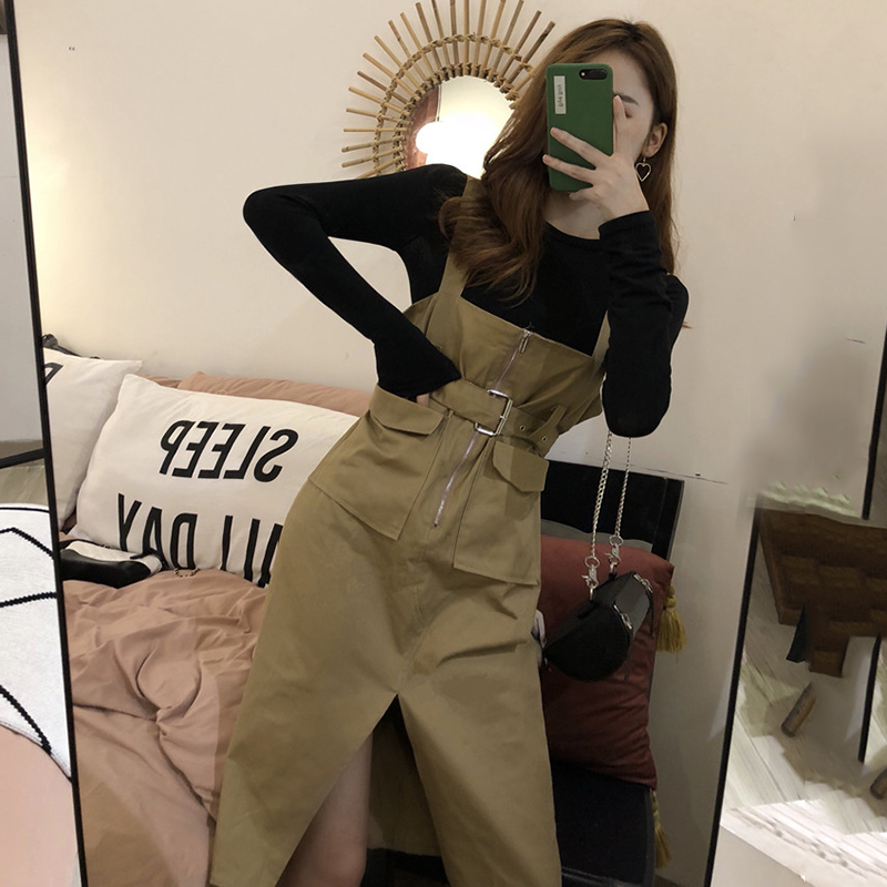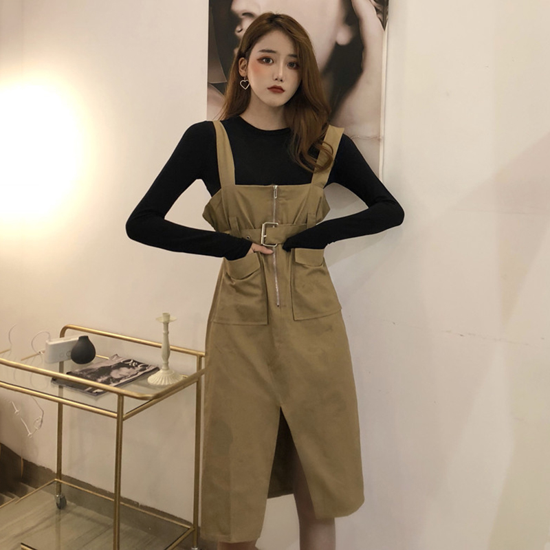 / 早秋兩件套女裝新款黑色長袖打底T恤寬松開叉收腰顯瘦背帶連衣裙