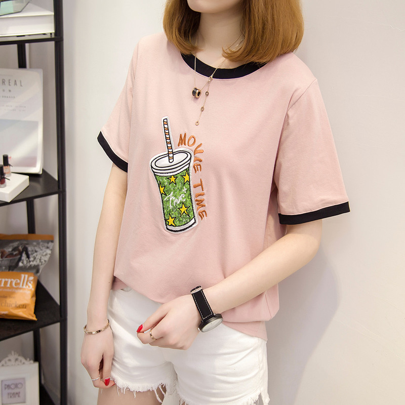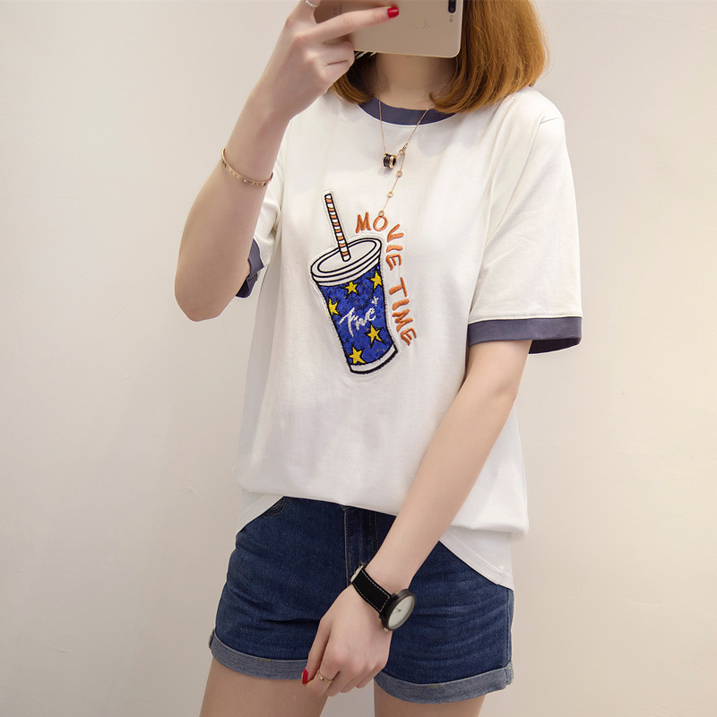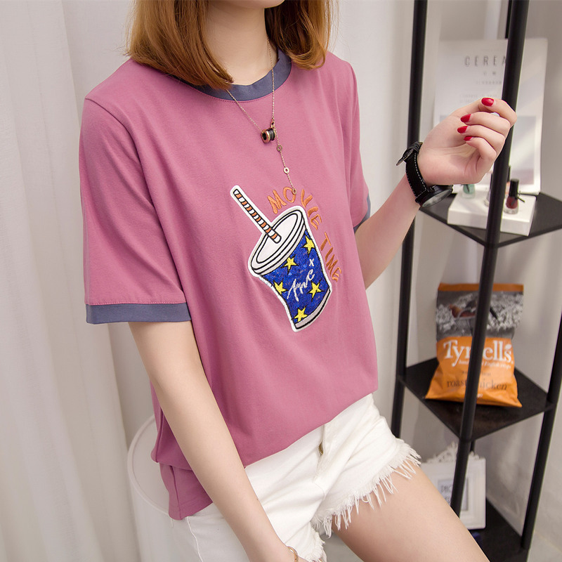 / 短袖上衣女夏新款刺繡寬松t恤女拼接打底韓版休閑體恤衫百搭