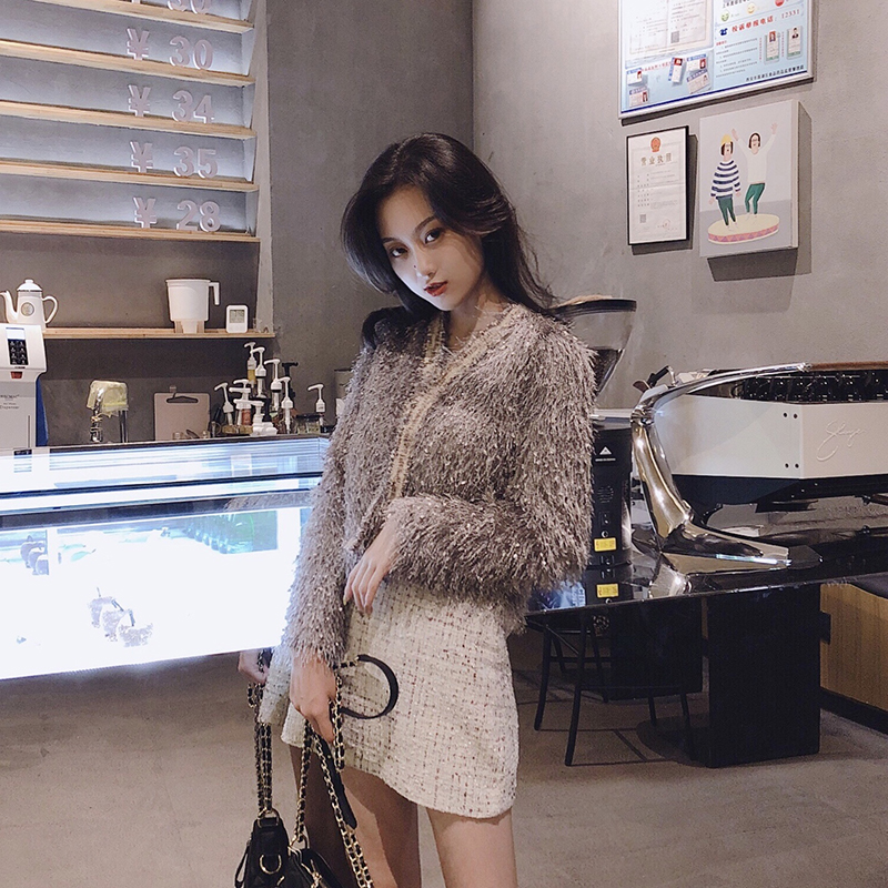 女神套裝秋流蘇毛毛開衫小外套上衣+不規則設計感高腰皮裙兩件套