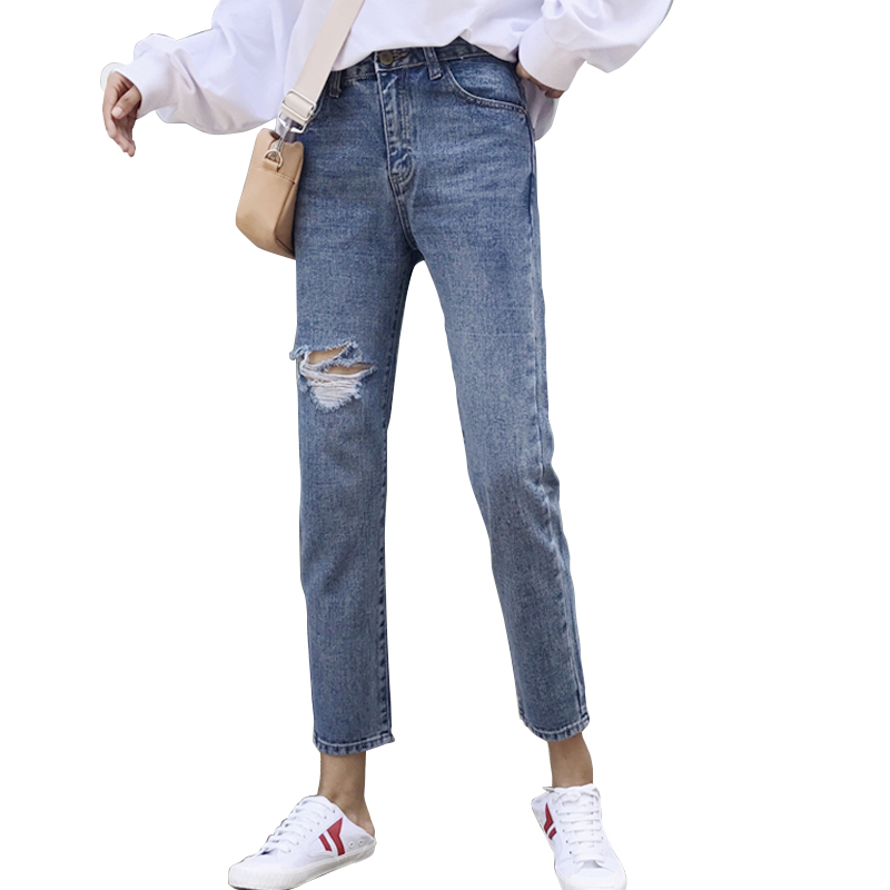 / 秋裝女裝韓版高腰個性膝蓋破洞牛仔褲百搭顯瘦九分褲直筒褲學生潮