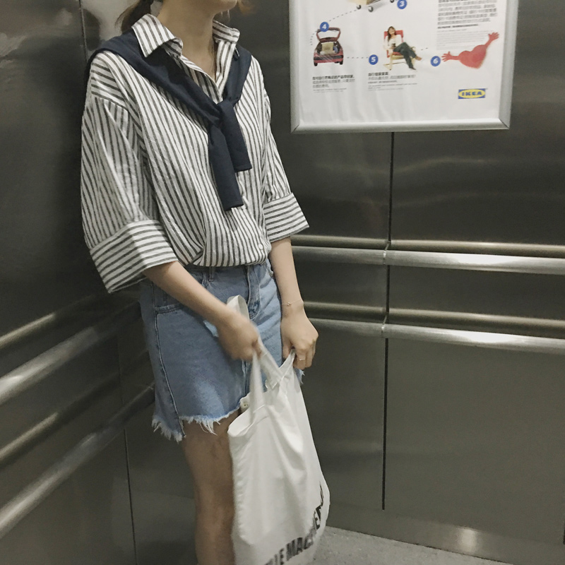 2017春季新款韓版學院風假兩件百搭披肩條紋棉麻襯衫女休閑襯衣