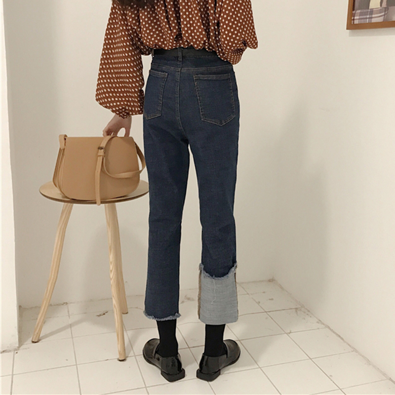 不對稱褲腳牛仔褲女秋冬裝2018新款韓版高腰寬松顯瘦直筒九分褲子
