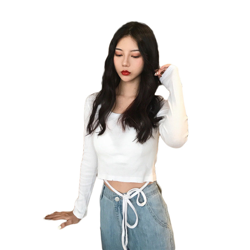 / 港味秋天上衣女時尚復古風修身顯瘦純色綁繩圓領百搭長袖打底T恤