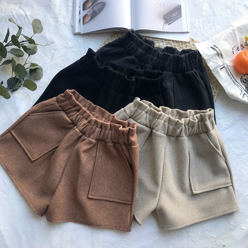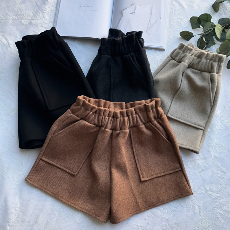 / 韓版黑色高腰顯瘦闊腿短褲子女秋冬裝新款學生復古風毛呢休閑靴褲