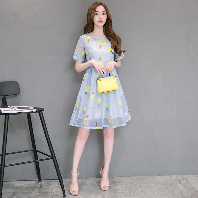 夏新款女裝修身甜美淑女中長款印花雪紡歐根紗短袖連衣裙女潮
