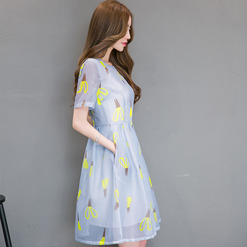 / 夏新款女裝修身甜美淑女中長款印花雪紡歐根紗短袖連衣裙女潮