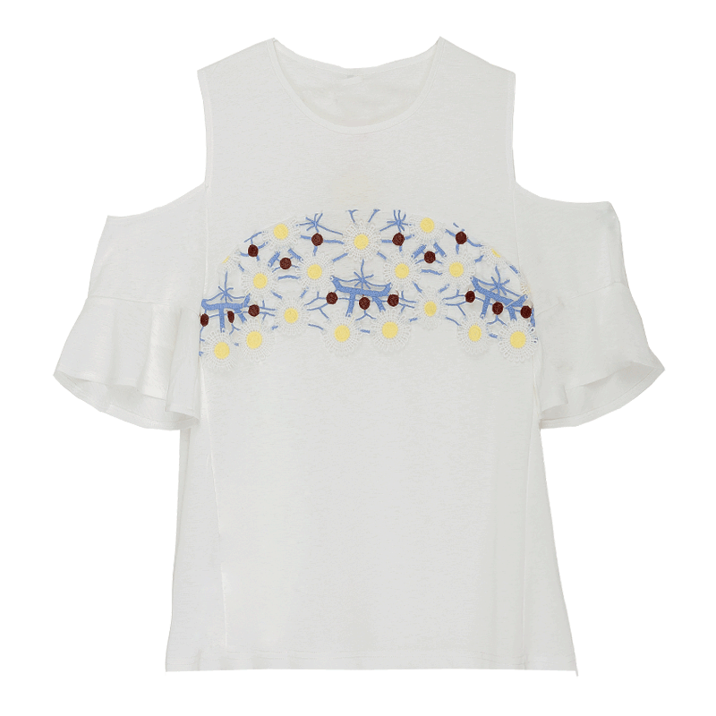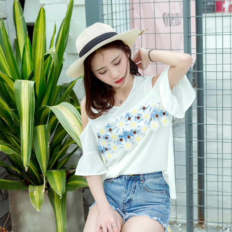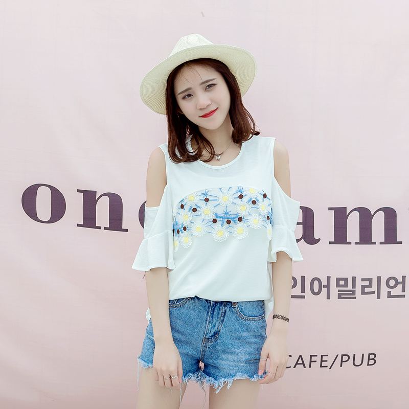/ 春夏裝韓版女裝新款學生寬松露肩上衣刺繡荷葉邊短袖雪紡衫潮
