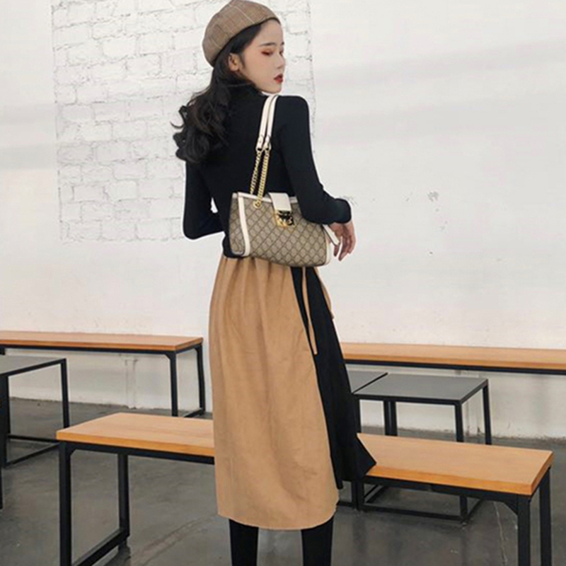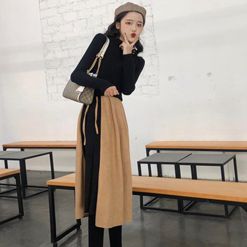 / 御姐套裝女秋冬新款拼接V領吊帶連衣裙子修身顯瘦黑色長袖T恤上衣