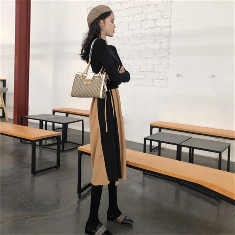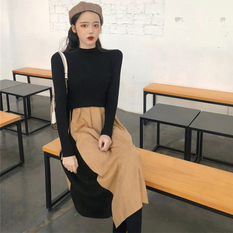 御姐套裝女秋冬新款拼接V領吊帶連衣裙子修身顯瘦黑色長袖T恤上衣