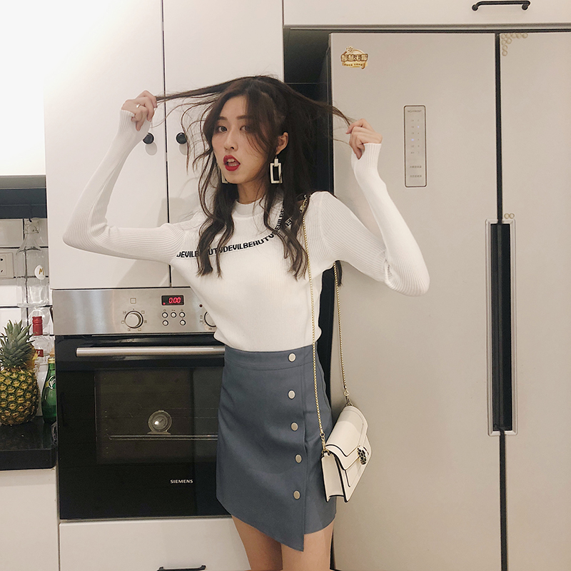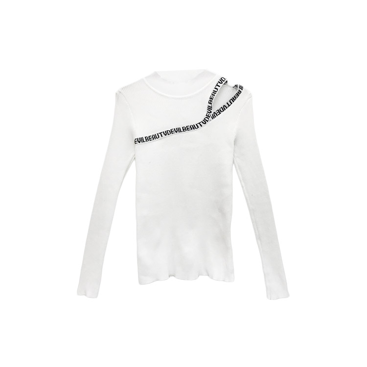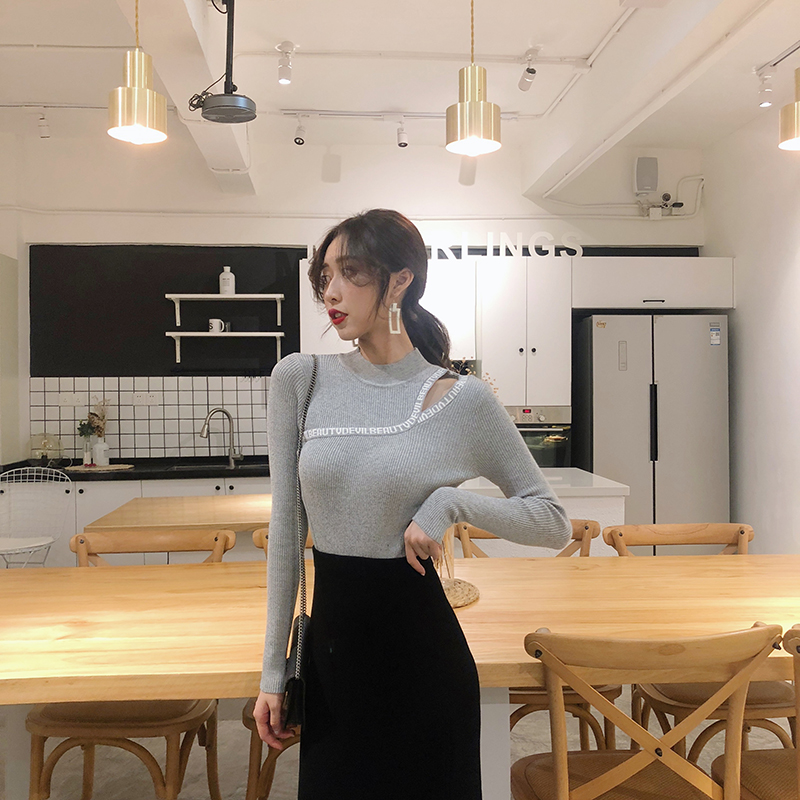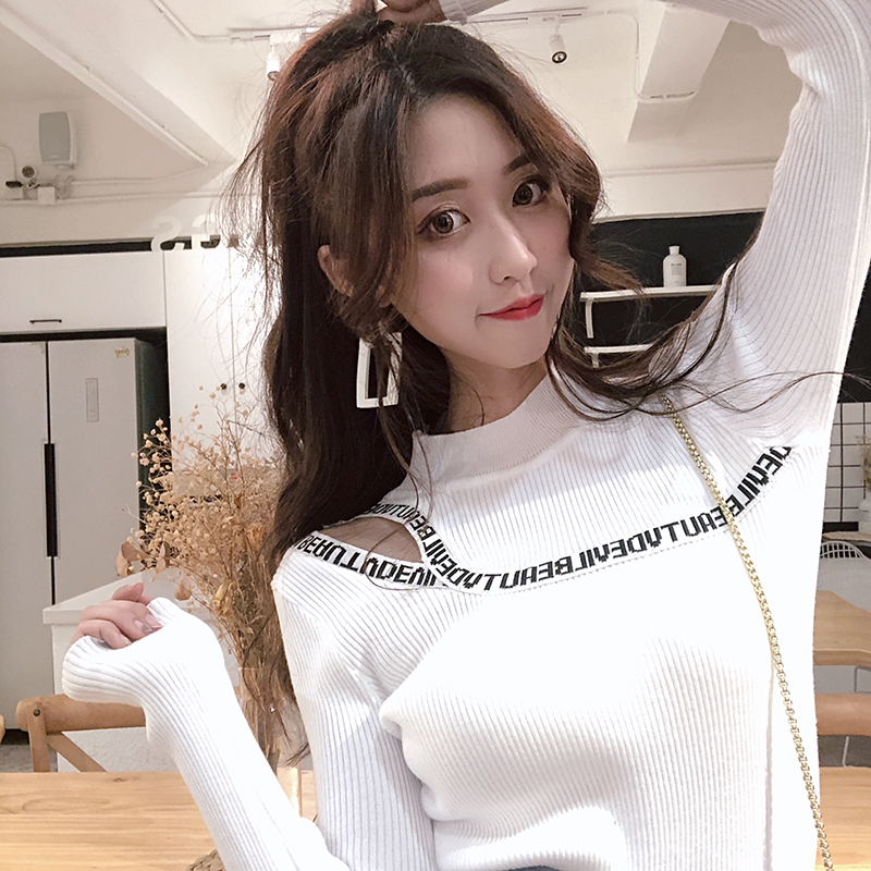 秋裝女2018新款修身韓版顯瘦長袖打底衫字母小心機鏤空坑條針織衫