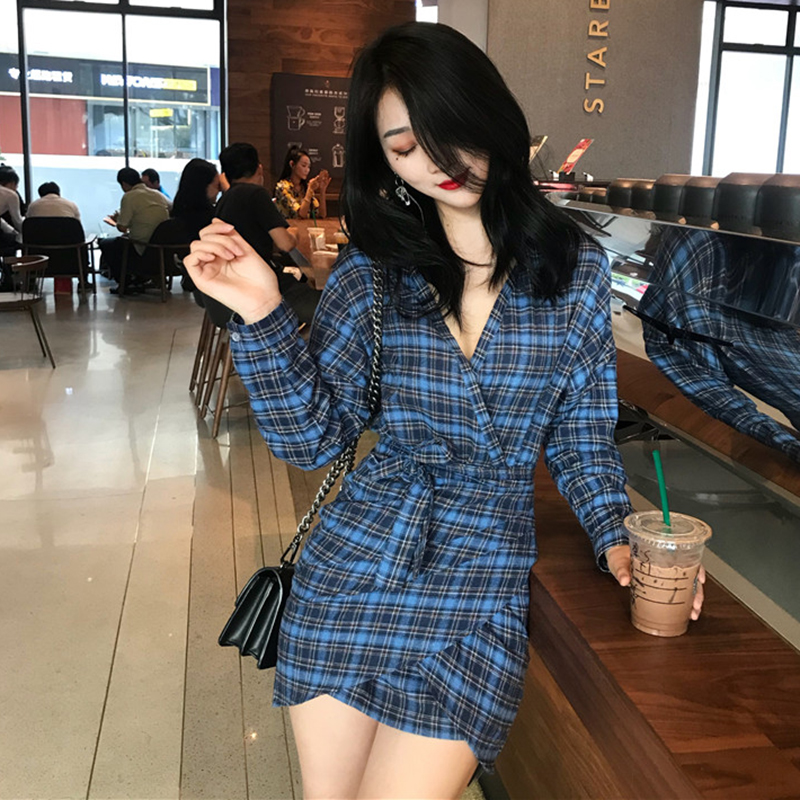 / 秋天2018新款女裝港味溫柔復古格子V領連衣裙氣質高腰包臀短裙子