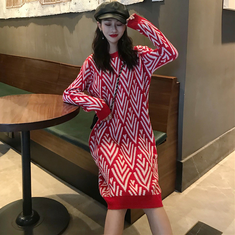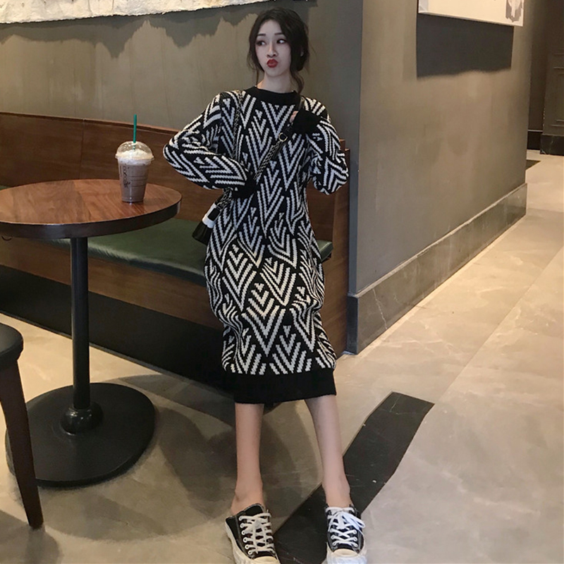 chic中長款撞色毛衣裙女秋冬裝2018新款韓版寬松套頭長袖連衣裙子
