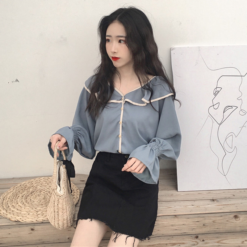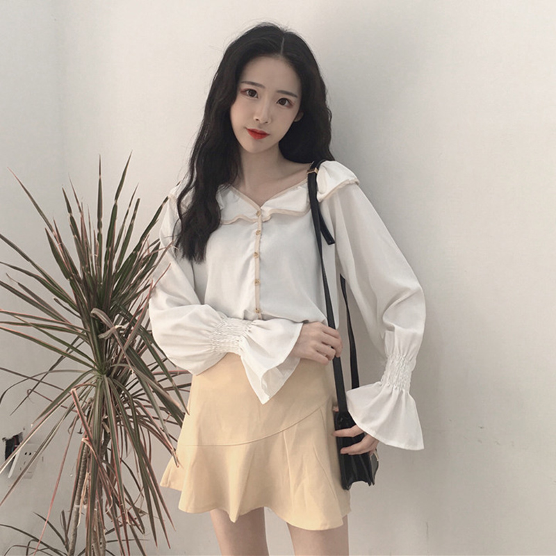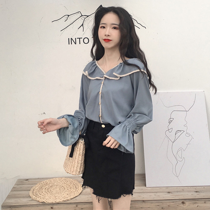 / 秋裝新款韓版小清新甜美荷葉邊V領喇叭袖純色長袖女裝雪紡衫襯衣