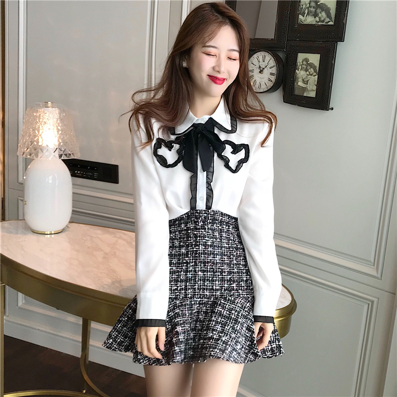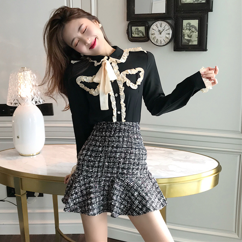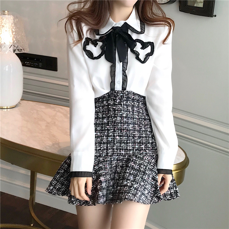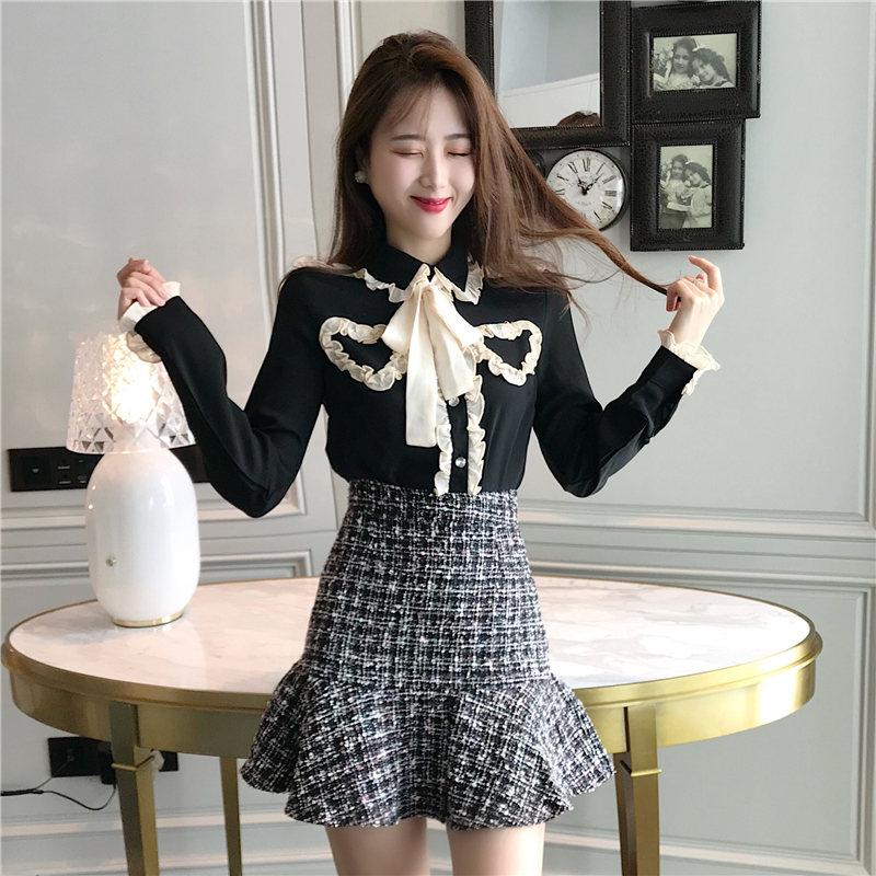 / 小香風套裝女秋新款拼色蝴蝶結雪紡襯衫+粗花呢魚尾a字半身短裙子