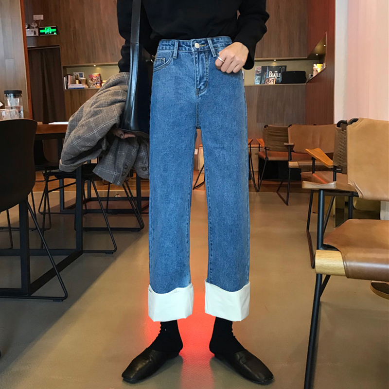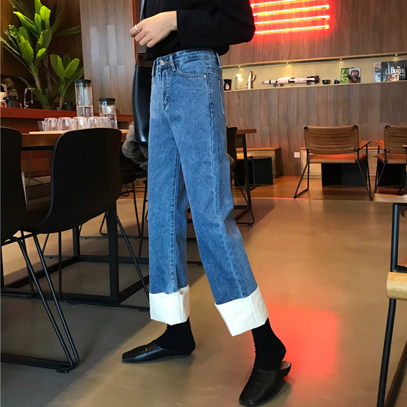 高腰顯瘦撞色卷邊牛仔褲女秋冬裝新款復古風直筒寬松闊腿九分褲子