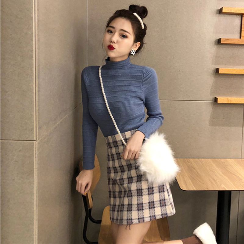 兩件套裝女秋冬新款小高領修身長袖針織打底衫高腰顯瘦格子半身裙