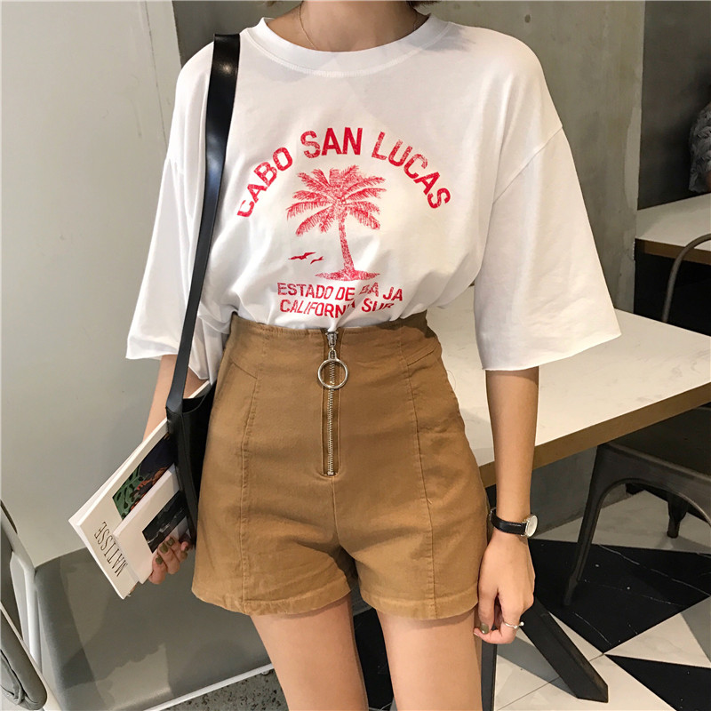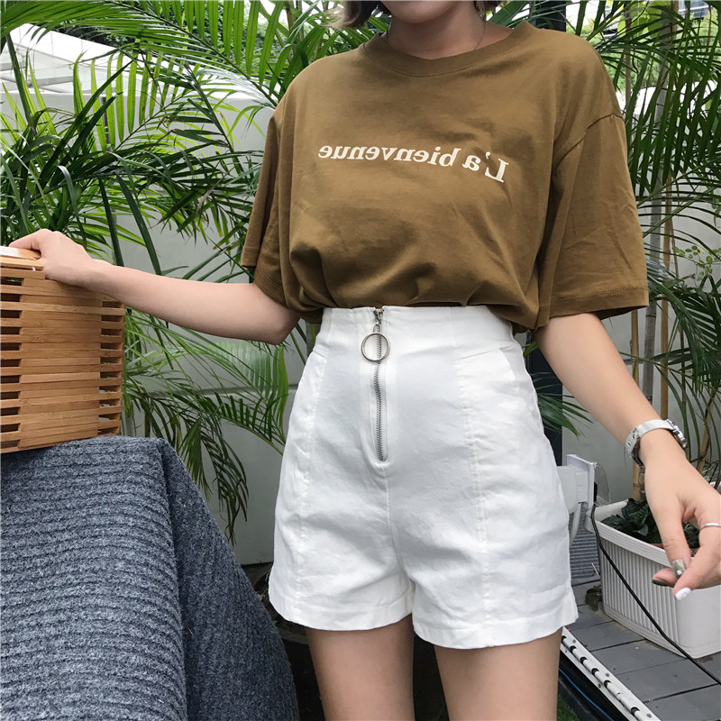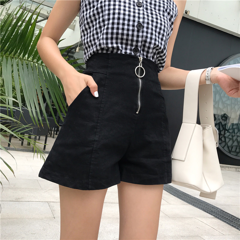 復古韓國chic風百搭顯瘦高彈A字闊腿褲夏季圓環拉鏈休閑褲短褲女
