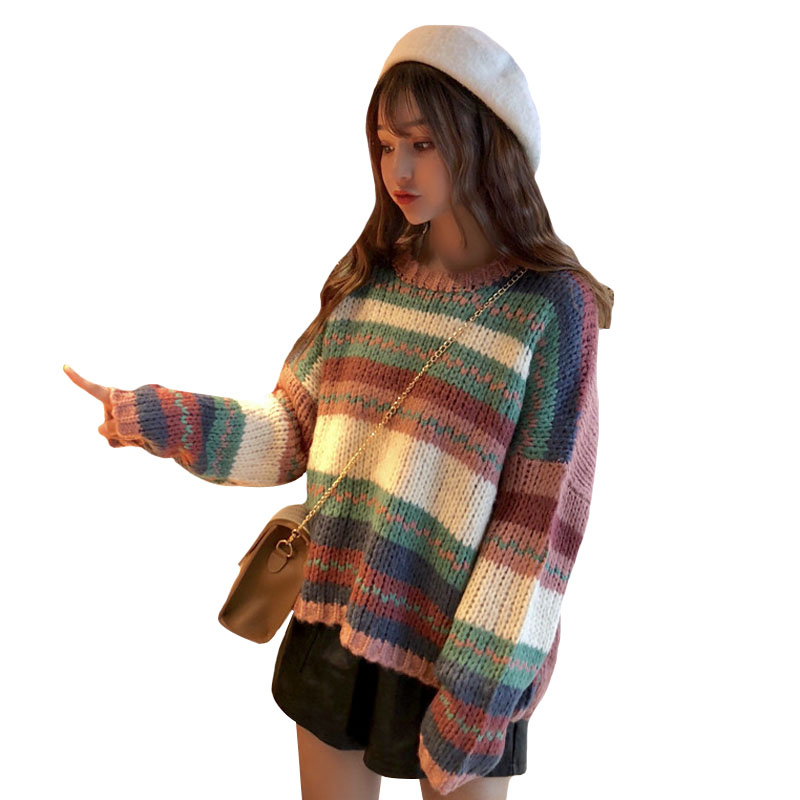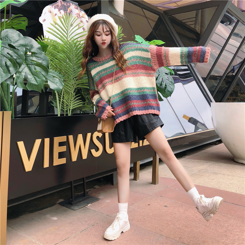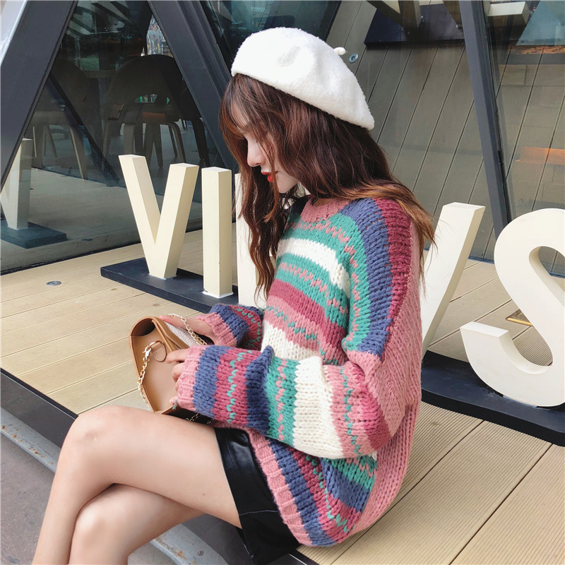 秋季女裝韓版慵懶風復古寬松拼色彩條網紅套頭針織衫毛衣上衣外套